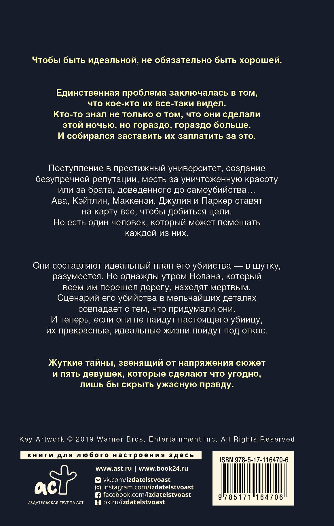 Поступление в престижный университет, создание безупречной репутации, месть за уничтоженную красоту или за брата, доведенного до самоубийства… Ава, Кэйтлин, Маккензи, Джулия и Паркер ставят на карту все, чтобы добиться цели. Но есть один человек, который может помешать каждой из них. Они составляют идеальный план его убийства - в шутку, разумеется. Но однажды утром Нолана, который всем им перешел дорогу, находят мертвым. Сценарий его убийства в мельчайших деталях совпадает с тем, что придумали они. И теперь, если они не найдут настоящего убийцу, их прекрасные, идеальные жизни пойдут под откос.| Издательство | ИЗДАТЕЛЬСТВО "АСТ" |