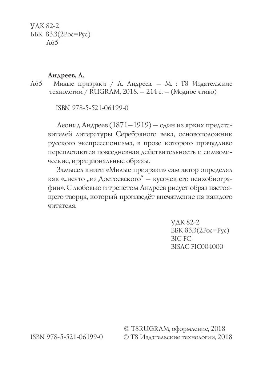 Леонид Андреев (1871-1919) - один из ярких представителей литературы Серебряного века, основоположник русского экспрессионизма, в прозе которого причудливо переплетаются повседневная действительность и символические, иррациональные образы. Замысел книги «Милые призраки» сам автор определял как «...нечто «из Достоевского» - кусочек его психо-биографии». С любовью и трепетом Андреев рисует образ настоящего творца, который произведёт впечатление на каждого читателя.| Издательство | Т8 RUGRAM |
