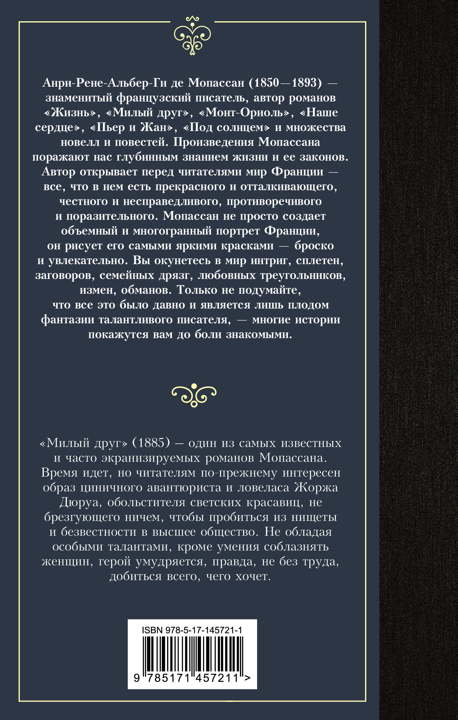 "Милый друг" (1885) - один из самых известных и часто экранизируемых романов Мопассана. Время идет, но читателям по-прежнему интересен образ циничного авантюриста и ловеласа Жоржа Дюруа, обольстителя светских красавиц, не брезгующего ничем, чтобы пробиться из нищеты и безвестности в высшее общество. Не обладая особыми талантами, кроме умения соблазнять женщин, герой умудряется, правда, не без труда, добиться всего, чего хочет.| Издательство | ИЗДАТЕЛЬСТВО "АСТ" |