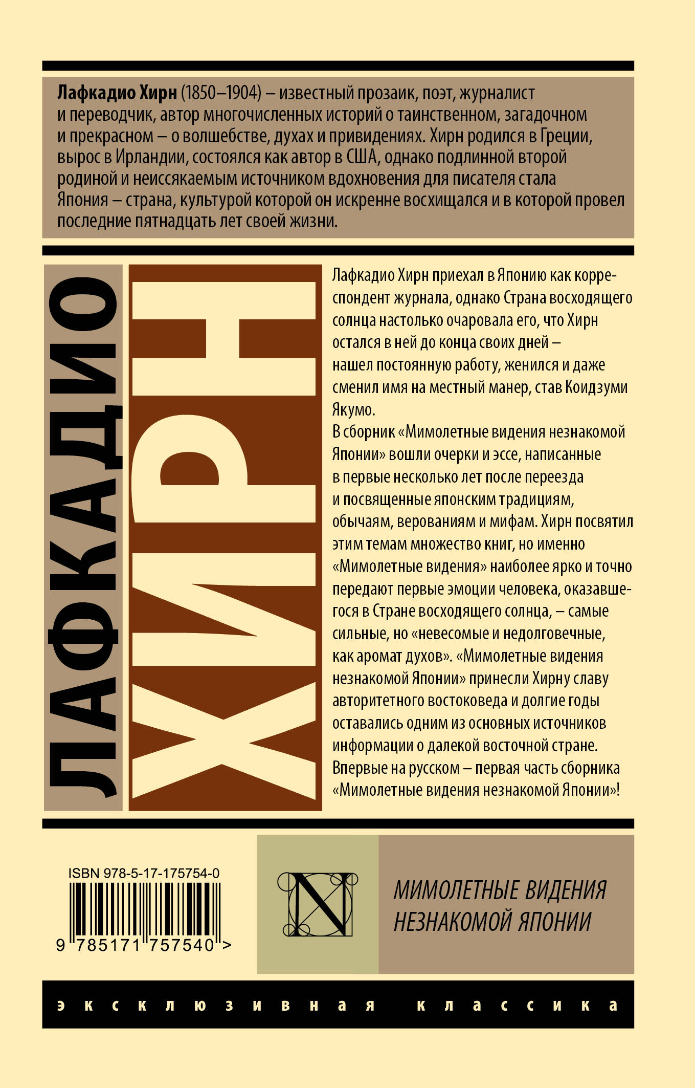 - Американский журналист Лафкадио Хирн приехал в Японию в командировку, но Страна восходящего солнца настолько покорила его, что он остался в ней до конца своих дней. - В сборник «Мимолетные видения незнакомой Японии» вошли очерки и эссе, написанные вскоре после приезда и посвященные местным традициям, обычаям и верованиям. - Долгие годы «Мимолетные видения» оставались главным источником информации о далекой восточной стране. - Первая часть сборника «Мимолетные видения» публикуется на русском языке впервые. - Издание в серии «Эксклюзивная классика» - в удобном карманном формате и узнаваемом оформлении.| Издательство | Издательство "АСТ" |