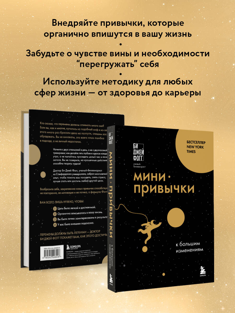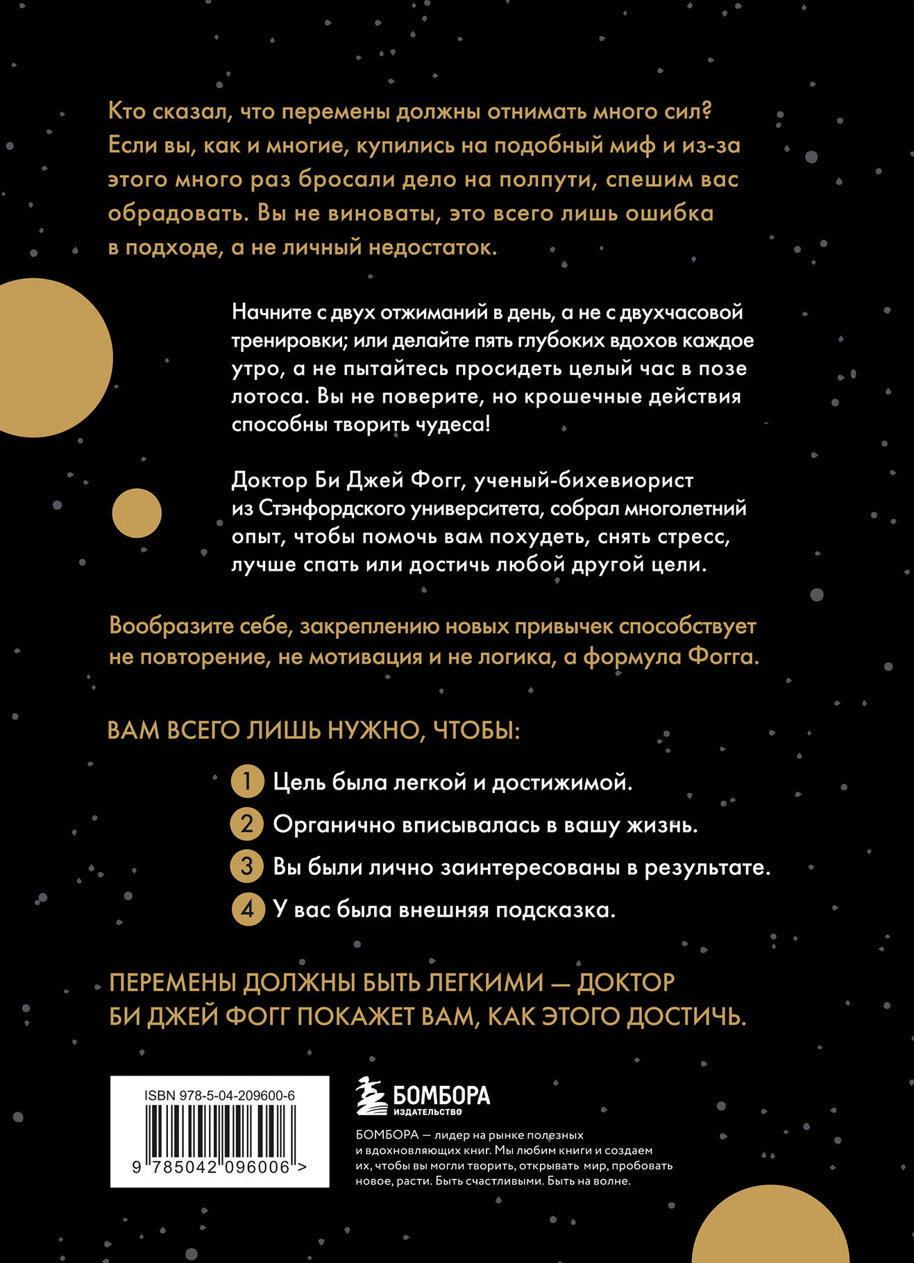 БЕСТСЕЛЛЕР NEW YORK TIMES! Кто сказал, что перемены должны отнимать много сил? Если вы, как и многие, купились на подобный миф и из-за этого много раз бросали дело на полпути, спешим вас обрадовать. Вы не виноваты, это всего лишь ошибка в подходе, а не личный недостаток. Начните с двух отжиманий в день, а не с двухчасовой тренировки; или делайте пять глубоких вдохов каждое утро, а не пытайтесь просидеть целый час в позе лотоса. Вы не поверите, но крошечные действия способны творить чудеса! Доктор БиДжей Фогг, ведущий мировой эксперт по формированию привычек, собрал многолетний опыт, чтобы помочь вам похудеть, снять стресс, лучше спать или достичь любой другой цели. Вообразите себе, закреплению новых привычек способствует не повторение, не мотивация и не логика, а Волшебная формула Фогга. Вам всего лишь нужно, чтобы: 1. Цель была легкой и достижимой. 2. Органично вписывалась в вашу жизнь. 3. Вы были лично заинтересованы в результате. 4. У вас была внешняя подсказка. Перемены должны быть легкими - БиДжей Фогг покажет вам, как этого достичь.| Издательство | ООО "Издательство "Эксмо" |