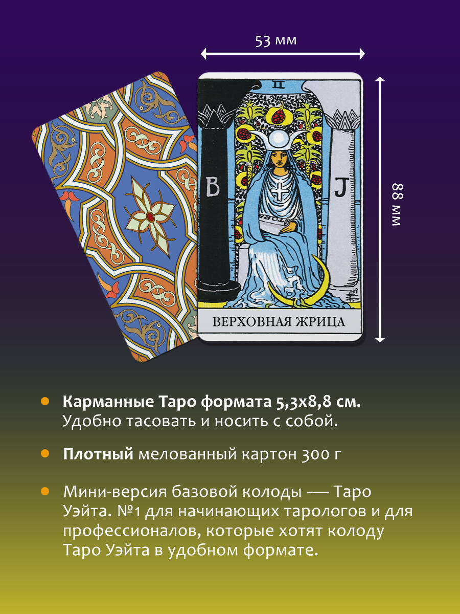 "Мини Таро Уэйта-Смит" - уникальный проводник мудрости в новом исполнении. Карты небольшого, удобного формата размером с кредитную карточку. Их удобно держать в руках, брать с собой в дорогу и использовать в качестве дополнения к основной колоде во время гадания. Мало какой современный таролог выходит из дома без "походной" колоды. Настолько привычно становится иметь при себе универсального советчика и средство коммуникации с миром. Небольшая инструкция под размер карт объяснит их основные значения и поможет в гадании новичкам.