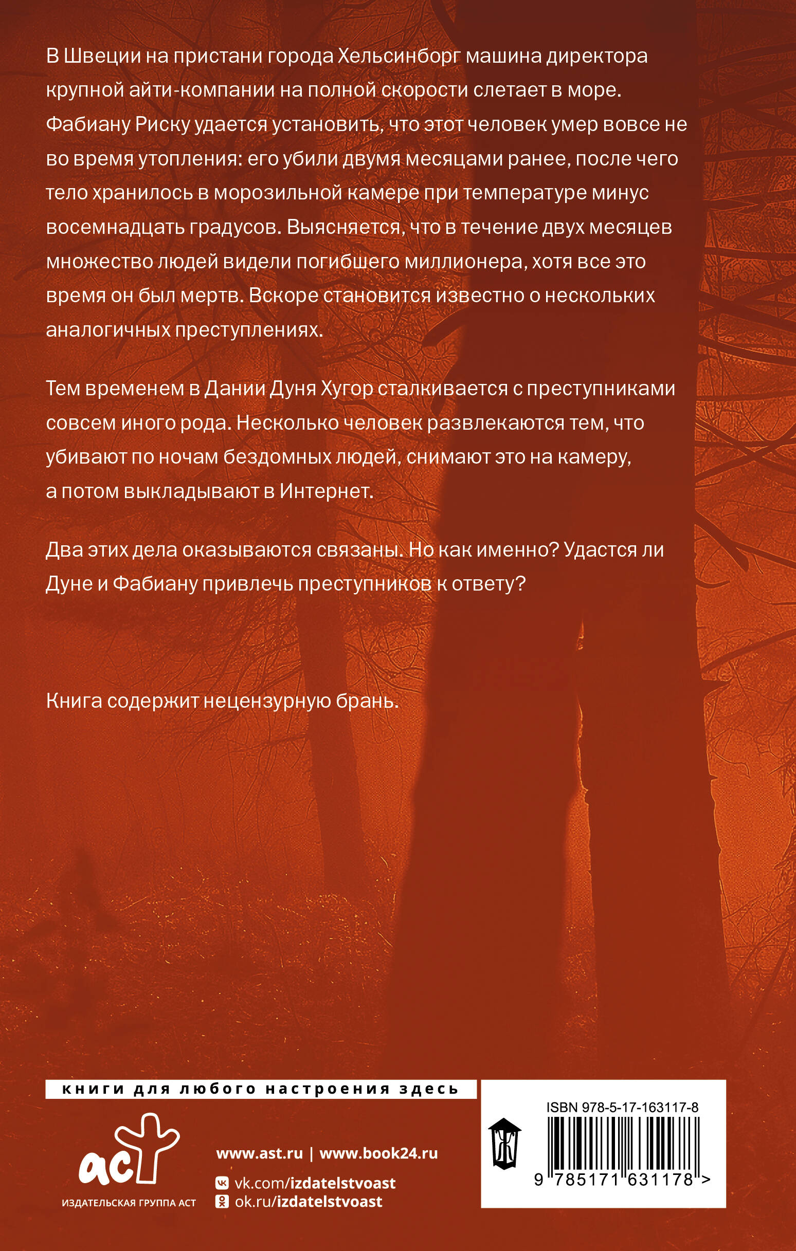 В Швеции на пристани города Хельсинборг машина директора крупной айти-компании на полной скорости слетает в море. Фабиану Риску удается установить, что этот человек умер вовсе не во время утопления: его убили двумя месяцами ранее, после чего тело хранилось в морозильной камере при температуре минус восемнадцать градусов. Выясняется, что в течение двух месяцев множество людей видели погибшего миллионера, хотя все это время он был мертв. Вскоре становится известно о нескольких аналогичных преступлениях. Тем временем в Дании Дуня Хугор сталкивается с преступниками совсем иного рода. Несколько человек развлекаются тем, что убивают по ночам бездомных людей, снимают это на камеру, а потом выкладывают в Интернет. Два этих дела оказываются связаны. Но как именно? Удастся ли Дуне и Фабиану привлечь преступников к ответу?| Издательство | Издательство "АСТ" |