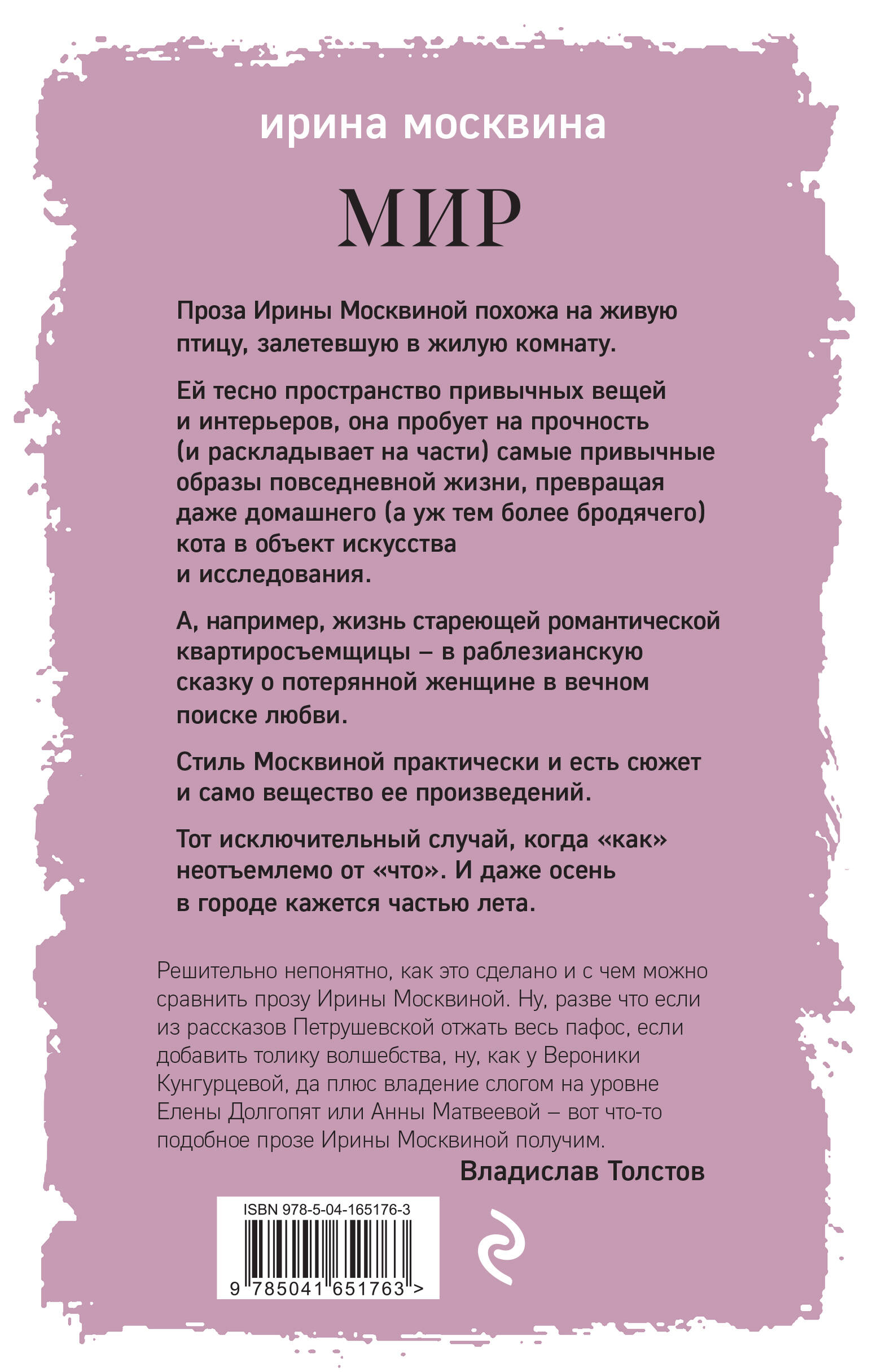 Проза Ирины Москвиной похожа на живую птицу, залетевшую в жилую комнату. Ей тесно пространство привычных вещей и интерьеров, она пробует на прочность (и раскладывает на части) самые привычные образы повседневной жизни, превращая даже домашнего (а уж тем более бродячего) кота в объект искусства и исследования. А, например, жизнь стареющей романтической квартиросъемщицы - в раблезианскую сказку о потерянной женщине в вечном поиске любви. Стиль Москвиной практически и есть сюжет и само вещество ее произведений. Тот исключительный случай, когда «как» неотъемлемо от «что». И даже осень в городе кажется частью лета. Писателей с фамилией Москвина много: Марина, Татьяна, Тамара. Но Ирина Москвина - одна-единственная и ни на кого не похожа. Ирина Москвина - писатель, художник, кукольник. Окончила Санкт-Петербургскую государственную академию театрального искусства. Живет в Петербурге, работает художником и преподавателем авторской куклы.| Издательство | ООО "Издательство "Эксмо" |