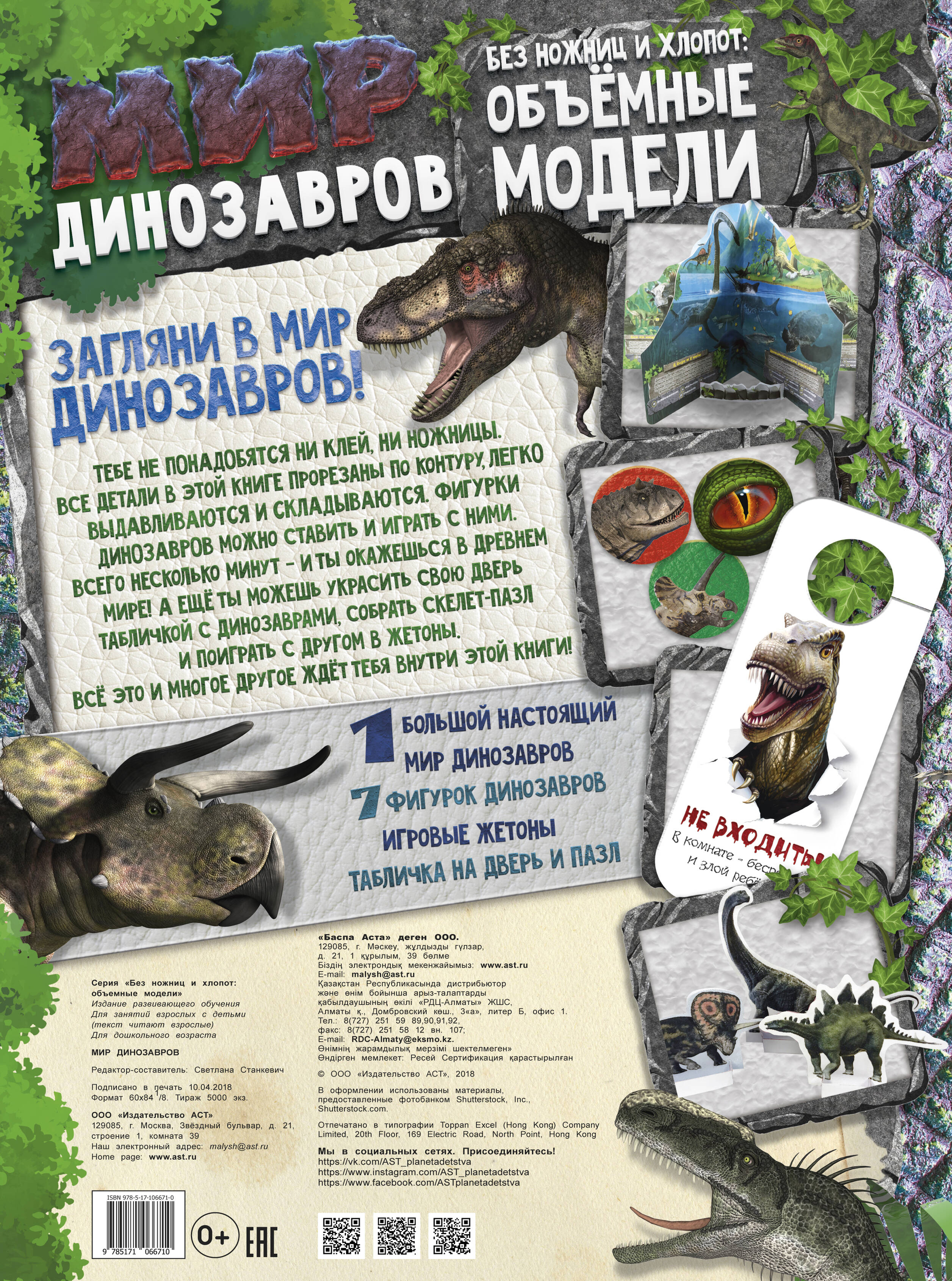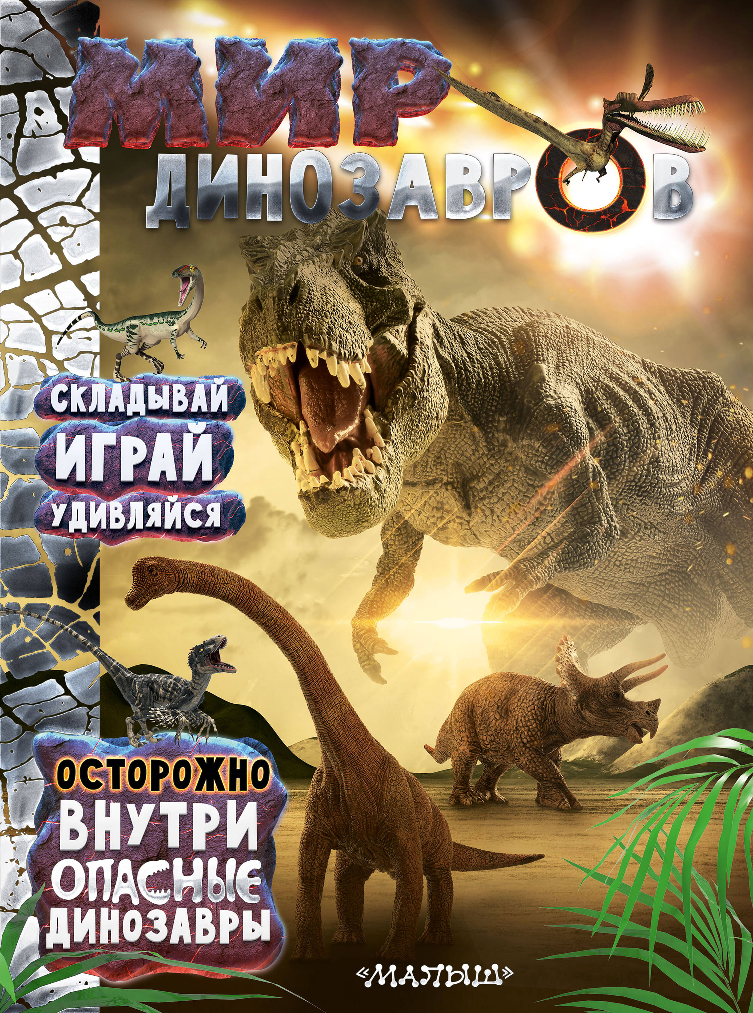 Вам не понадобятся ни клей, ни ножницы! Все детали в этой книге прорезаны по контуру, легко выдавливаются и складываются. Фигурки динозавров можно ставить и играть с ними. Всего несколько минут - и вы окажетесь в древнем мире! А еще можно украсить дверь табличкой с динозаврами, собрать скелет-пазл и поиграть с другом в жетоны. Всё это и многое другое ждет тебя внутри этой книги! - 1 большой настоящий мир динозавров. - 7 фигурок динозавров. - Игровые жетоны. - Табличка на дверь. - Пазл.