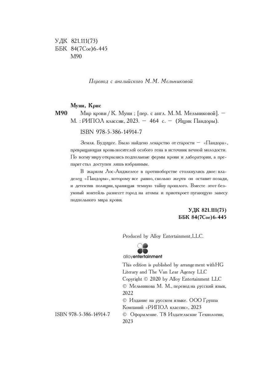 Земля. Будущее. Было найдено лекарство от старости - "Пандора", превращающая кровь носителей особого гена в источник вечной молодости. По всему миру открылись подпольные фермы крови и лаборатории, а элексир стал доступен лишь избранным. В жарком Лос-Анджелесе в противоборстве столкнулись двое: владелец "Пандоры", которому все равно, сколько жертв он оставит позади, и детектив полиции, хранящая темную тайну прошлого. Вместе этот безумный коктейль разнесет город на атомы и приоткроет пугающую завесу подпольного мира крови.| Издательство | Рипол Классик |