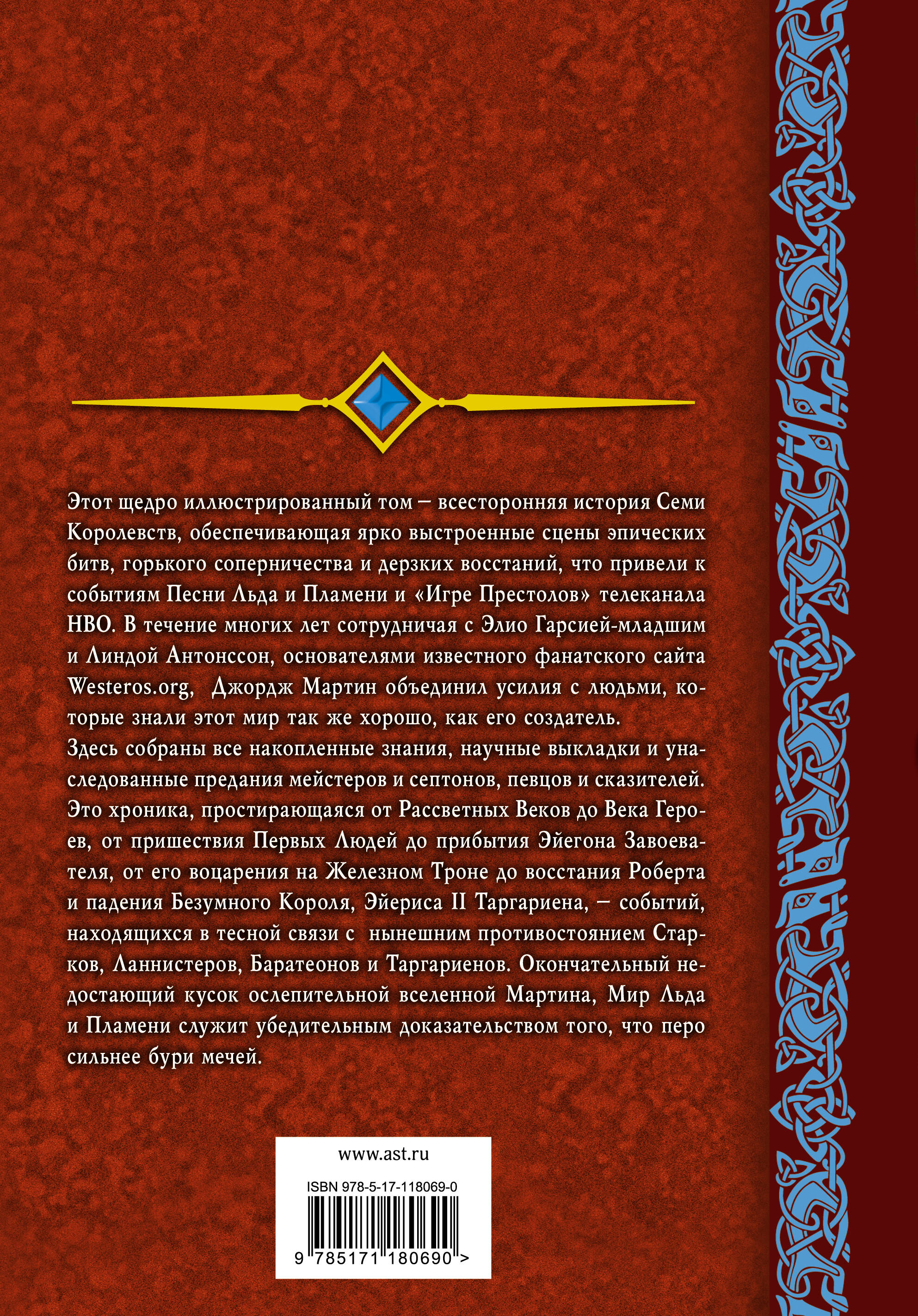 Этот щедро иллюстрированный том - всесторонняя история Семи Королевств, обеспечивающая ярко выстроенные сцены эпических битв, горького соперничества, и дерзких восстаний, что привели к событиям "Песни Льда и Пламени" и "Игре Престолов" телеканала НВО. В течение многих лет сотрудничая с Элио Гарсией-младшим и Линдой Антонссон, основателями известного фанатского сайта Westeros.org, Джордж Мартин объединил усилия с людьми, которые знали этот мир так же хорошо, как его создатель. Здесь собраны все накопленные знания, научные выкладки и унаследованные предания мейстеров и септонов, певцов и сказителей. Это хроника, простирающаяся от Рассветных Веков до Века Героев, от пришествия Первых Людей до прибытия Эйегона Завоевателя, от его воцарения на Железном Троне до восстания Роберта и падения Безумного Короля, Эйериса II Таргариена, - события, находящиеся в тесной связи с нынешним противостоянием Старков, Ланнистеров, Баратеонов и Таргариенов. Окончательный недостающий кусок ослепительной вселенной Мартина, "Мир Льда и Пламени" служит убедительным доказательством того, что перо сильнее бури мечей.| Издательство | Издательство "АСТ" |