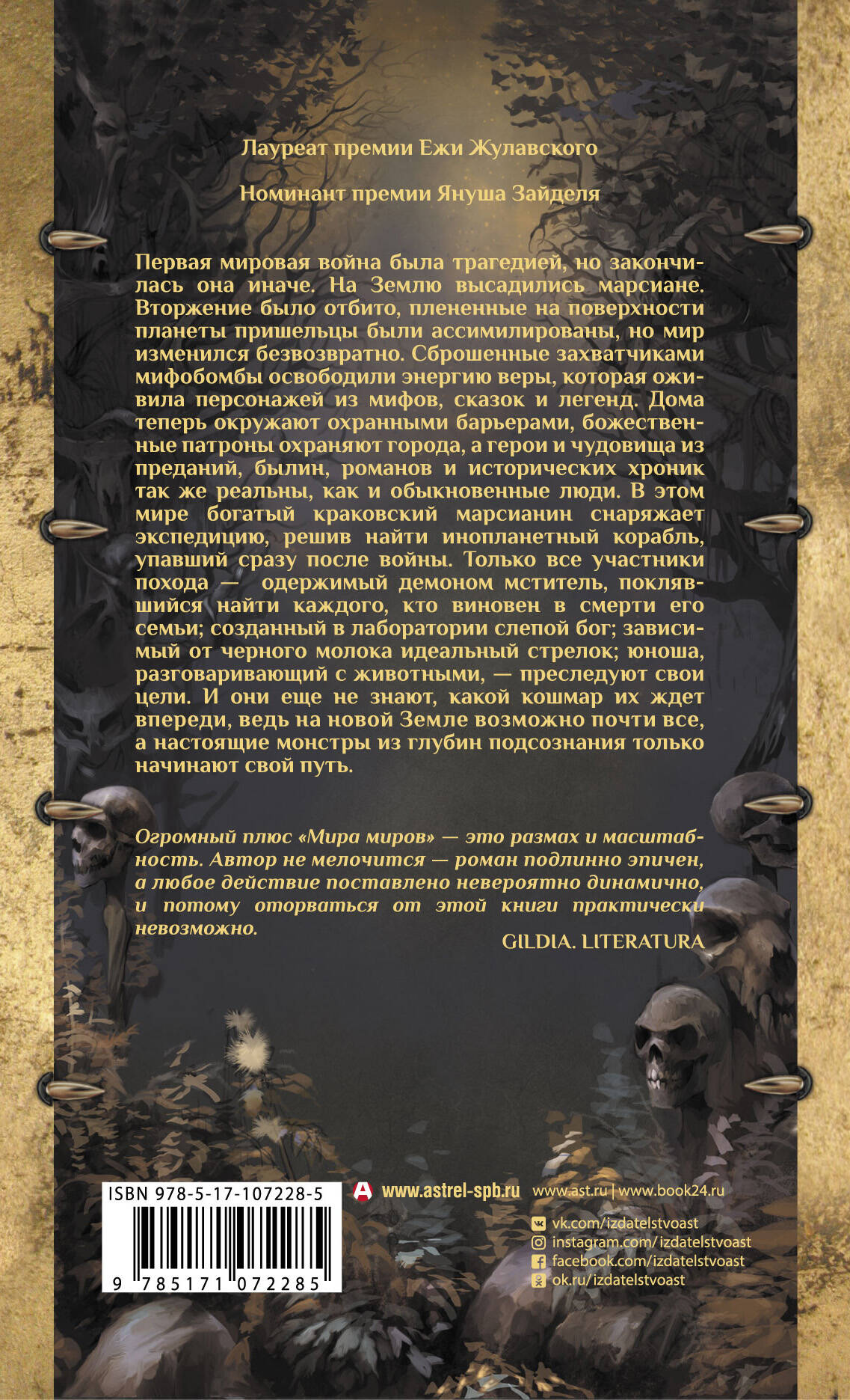 Первая мировая война была трагедией, но закончилась она иначе. На Землю высадились марсиане. Вторжение было отбито, плененные на поверхности планеты пришельцы были ассимилированы, но мир изменился безвозвратно. Сброшенные захватчиками мифобомбы освободили энергию веры, которая оживила персонажей из мифов, сказок и легенд. Дома теперь окружают охранными барьерами, божественные патроны охраняют города, а герои и чудовища преданий, былин, романов и исторических хроник так же реальны, как и обыкновенные люди. В этом мире богатый краковский марсианин снаряжает экспедицию, решив найти инопланетный корабль, упавший сразу после войны. Только все участники похода - одержимый демоном мститель, поклявшийся найти каждого, кто виновен в смерти его семьи; созданный в лаборатории слепой бог; зависимый от черного молока идеальный стрелок; юноша, разговаривающий с животными, - преследуют свои цели. Они еще не знают, какой кошмар их ждет впереди, ведь на новой Земле возможно почти все, а настоящие монстры из глубин подсознания только начинают свой путь.| Издательство | ИЗДАТЕЛЬСТВО "АСТ" |