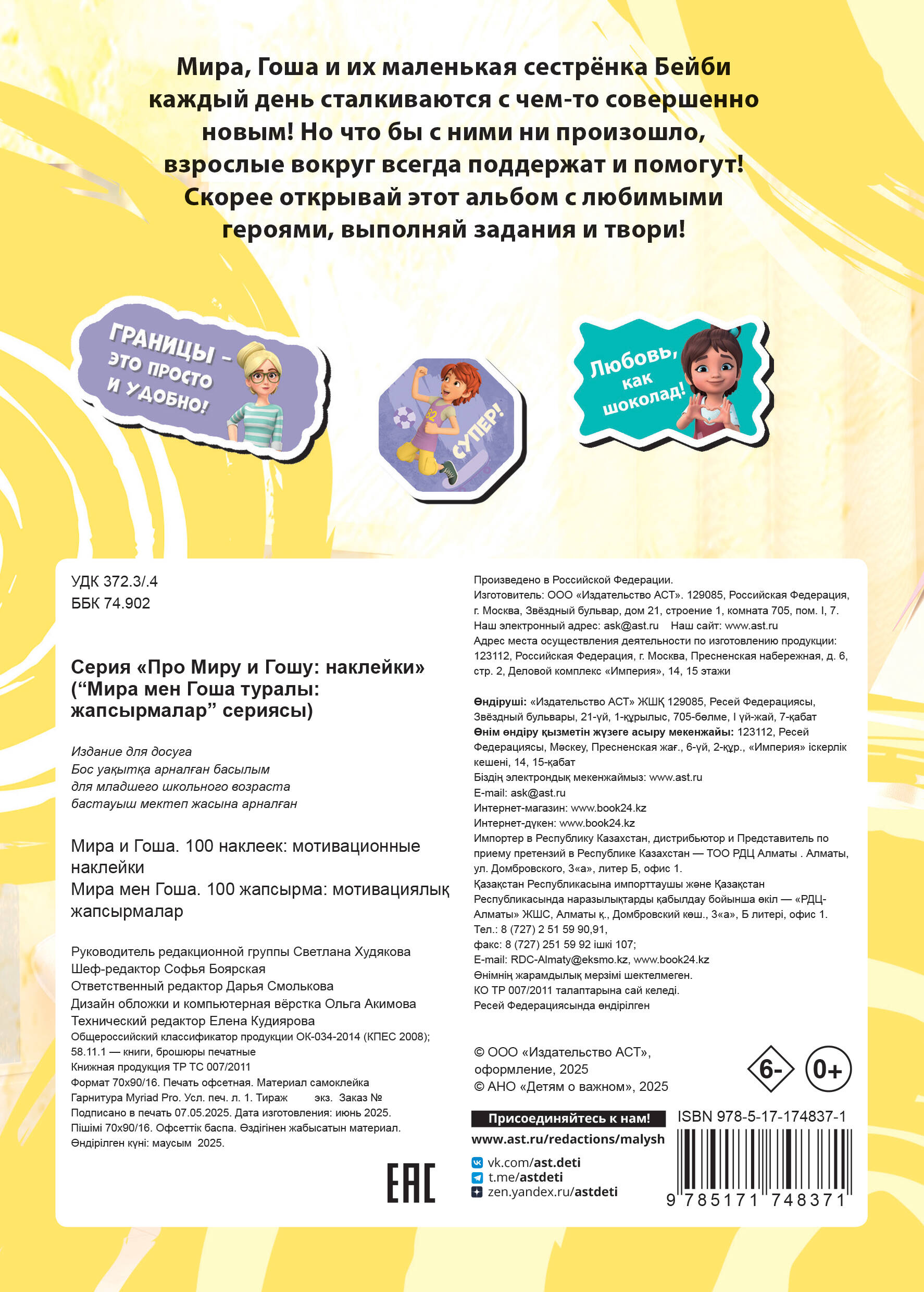 Перед тобой альбом наклеек с любимыми персонажами и цитатами из мультфильма «Про Миру и Гошу». Также в наборе есть стикеры с мотивационными фразами, чтобы сделать процесс обучения веселее и интереснее. Кроме наклеек на каждой страничке тебя ждут увлекательные задания, а также подсказки, которые помогут лучше узнать себя и своих близких! Эти наклейки идеально подходят для украшения тетрадей, дневников, телефона и других любых поверхностей, так любимые персонажи будут всегда с тобой!| Издательство | Издательство "АСТ" |