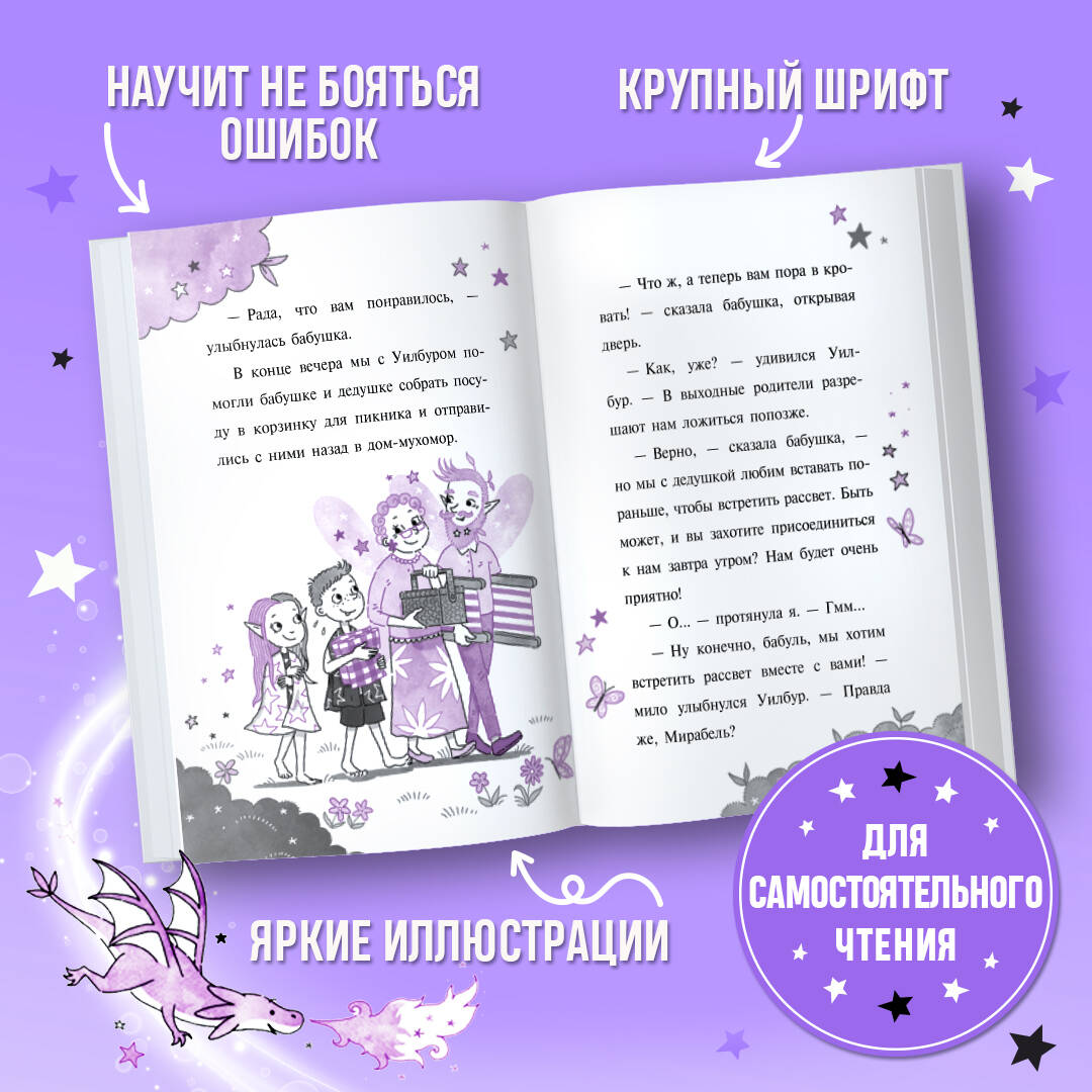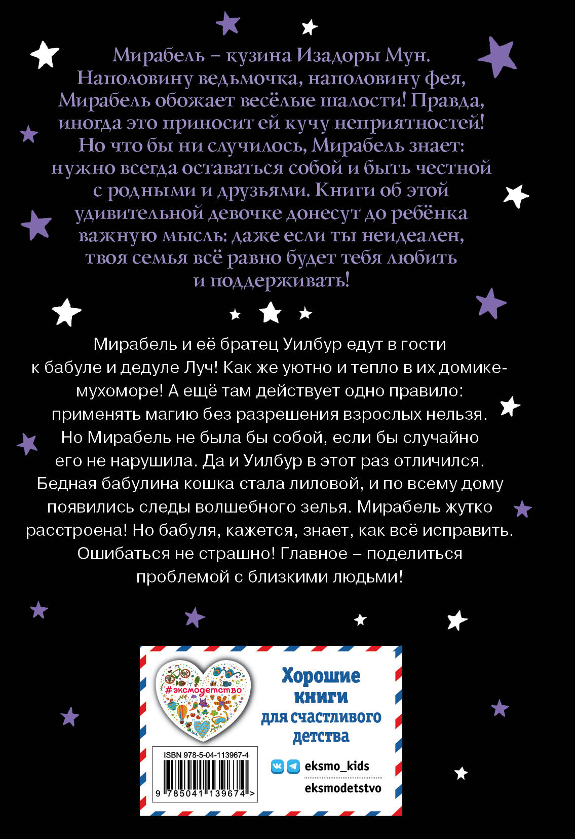 Одна из самых трогательных и уютных историй из серии «Изадора Мун»! Познакомьтесь с бабушкой Изадоры и Мирабель! Основной посыл книги: ошибаться можно, в этом нет ничего плохого. Важно не хранить свои ошибки в тайне от взрослых, а вместе с ними постараться их исправить! Мирабель и её братец Уилбур едут в гости к бабуле и дедуле Луч! Как же уютно и тепло в их домике-мухоморе! А ещё там действует одно правило: применять магию без разрешения взрослых нельзя. Но Мирабель не была бы собой, если бы случайно его не нарушила. Да и Уилбур в этот раз отличился. Бедная бабулина кошка стала лиловой, и по всему дому появились следы волшебного зелья. Мирабель жутко расстроена! Но бабуля, кажется, знает, как всё исправить. Чёрно-фиолетовые иллюстрации, белая бумага, удобный шрифт, историю легко читать самостоятельно - эта книга порадует и ребёнка, и родителей. Абсолютный бестселлер в России, который поможет детям полюбить читать и поверить в себя!| Издательство | ООО "Издательство "Эксмо" |