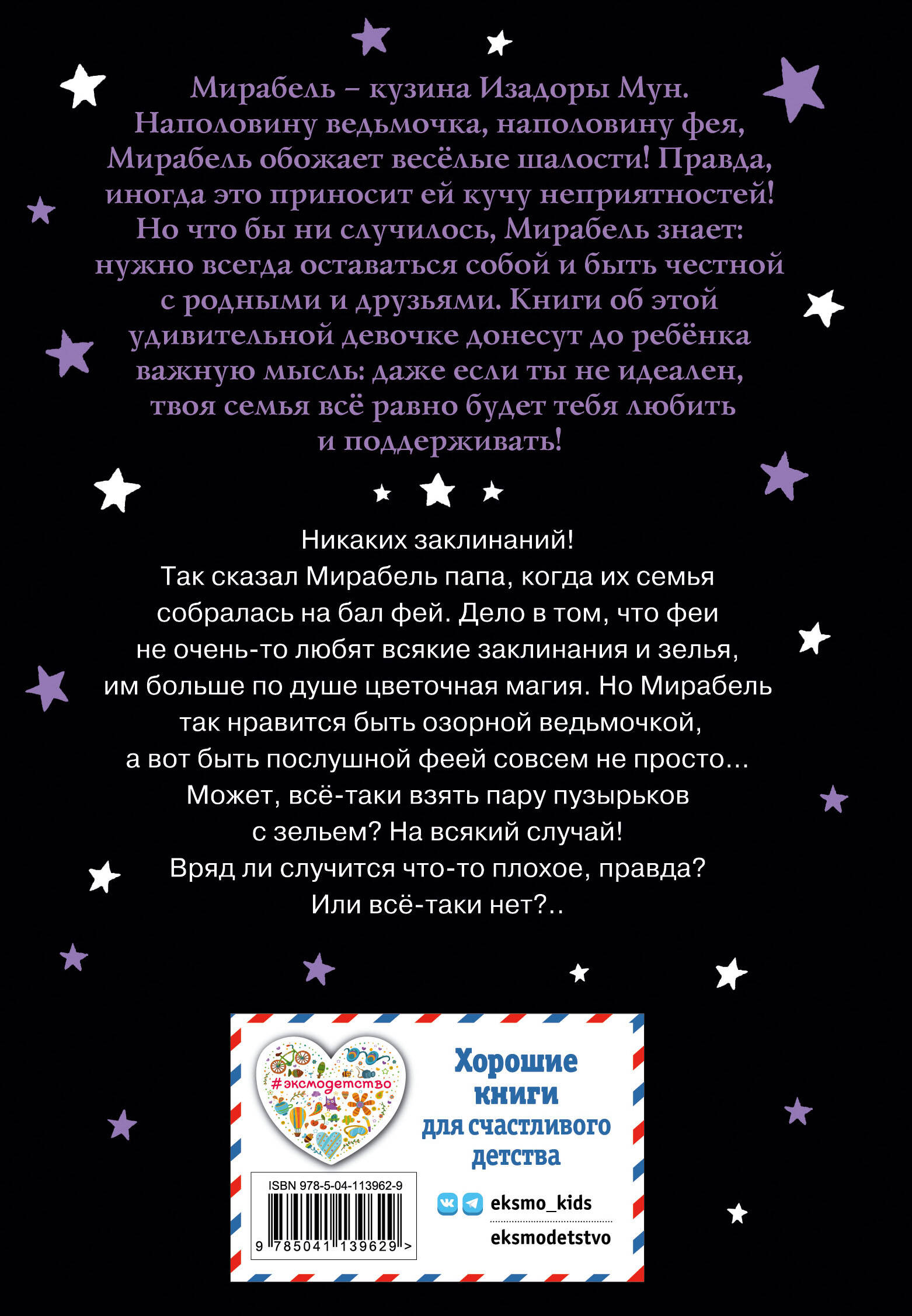 Познакомьтесь с Мирабель, кузиной Изадоры Мун! Наполовину ведьмочка, наполовину фея, она обожает шалости! И иногда из-за этого с ней приключаются разные неприятности. И всё же Мирабель знает: главное - оставаться собой и быть честной с родными и друзьями. Никаких заклинаний! Так сказал Мирабель папа, когда их семья собралась на бал фей. Дело в том, что феям больше по душе цветочная магия. Но Мирабель так нравится быть озорной ведьмочкой, а вот быть послушной феей совсем не просто… Может, всё-таки взять пару пузырьков с зельем? На всякий случай! Вряд ли случится что-то плохое, правда? Или всё-таки нет?.. Эта книга донесёт до ребёнка важную мысль: даже если ты не идеален, твоя семья всё равно будет тебя любить и поддерживать!| Издательство | Эксмо |
