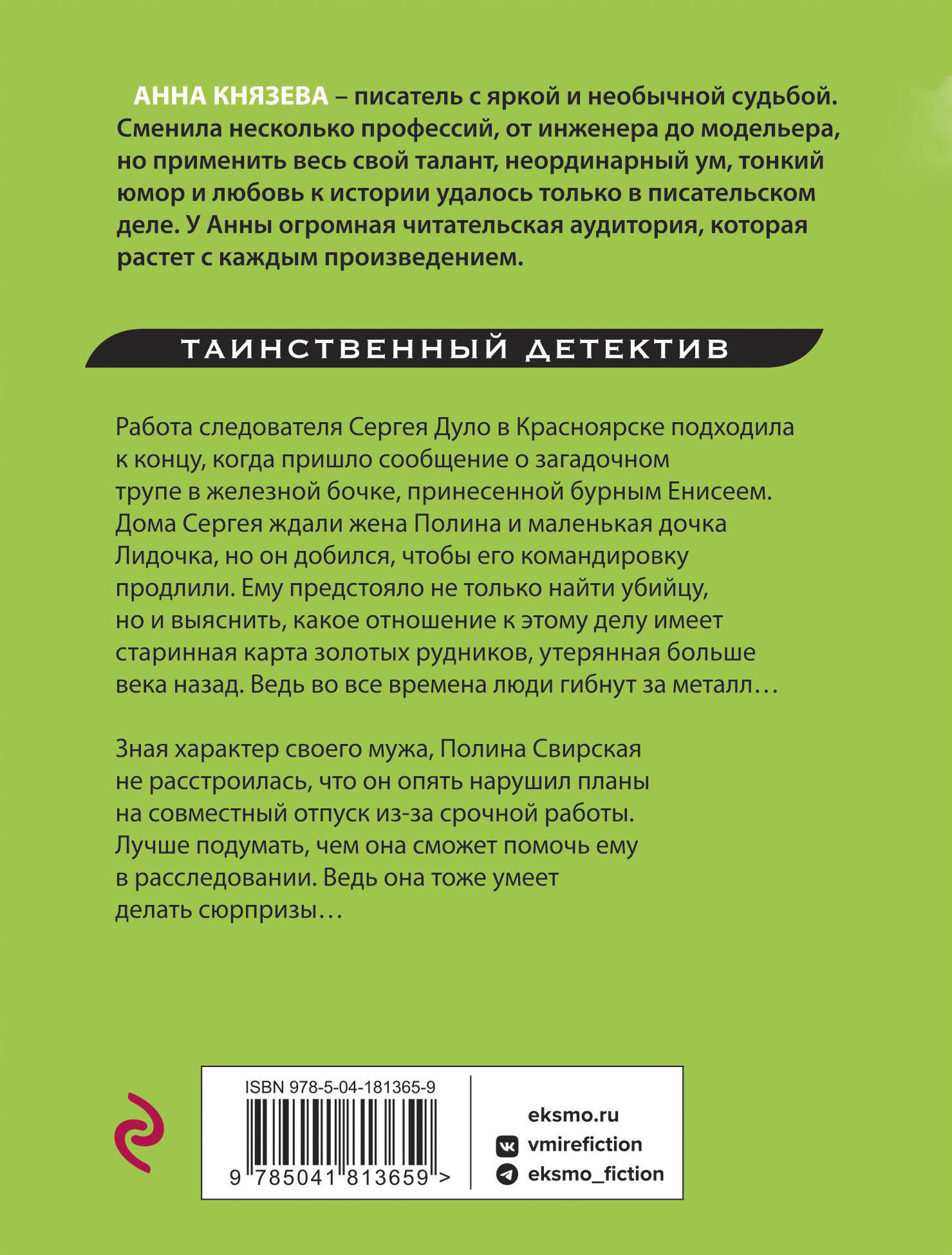 Работа следователя Сергея Дуло в Красноярске подходила к концу, когда пришло сообщение о загадочном трупе в железной бочке, принесенной бурным Енисеем. Дома Сергея ждали жена Полина и маленькая дочка Лидочка, но он добился, чтобы его командировку продлили. Ему предстояло не только найти убийцу, но и выяснить, какое отношение к этому делу имеет старинная карта золотых рудников, утерянная больше века назад. Ведь во все времена люди гибнут за металл… Зная характер своего мужа, Полина Свирская не расстроилась, что ее муж опять нарушил планы на совместный отпуск из-за срочной работы. Лучше подумать, чем она сможет помочь ему в расследовании. Ведь она тоже умеет делать сюрпризы… В остросюжетных романах Анны Князевой расследуются преступления, следы которых уводят в прошлое и позволяют пролить свет на его загадки. Вслед за героями вы отправитесь навстречу старинным тайнам и увлекательным приключениям!| Издательство | ООО "Издательство "Эксмо" |