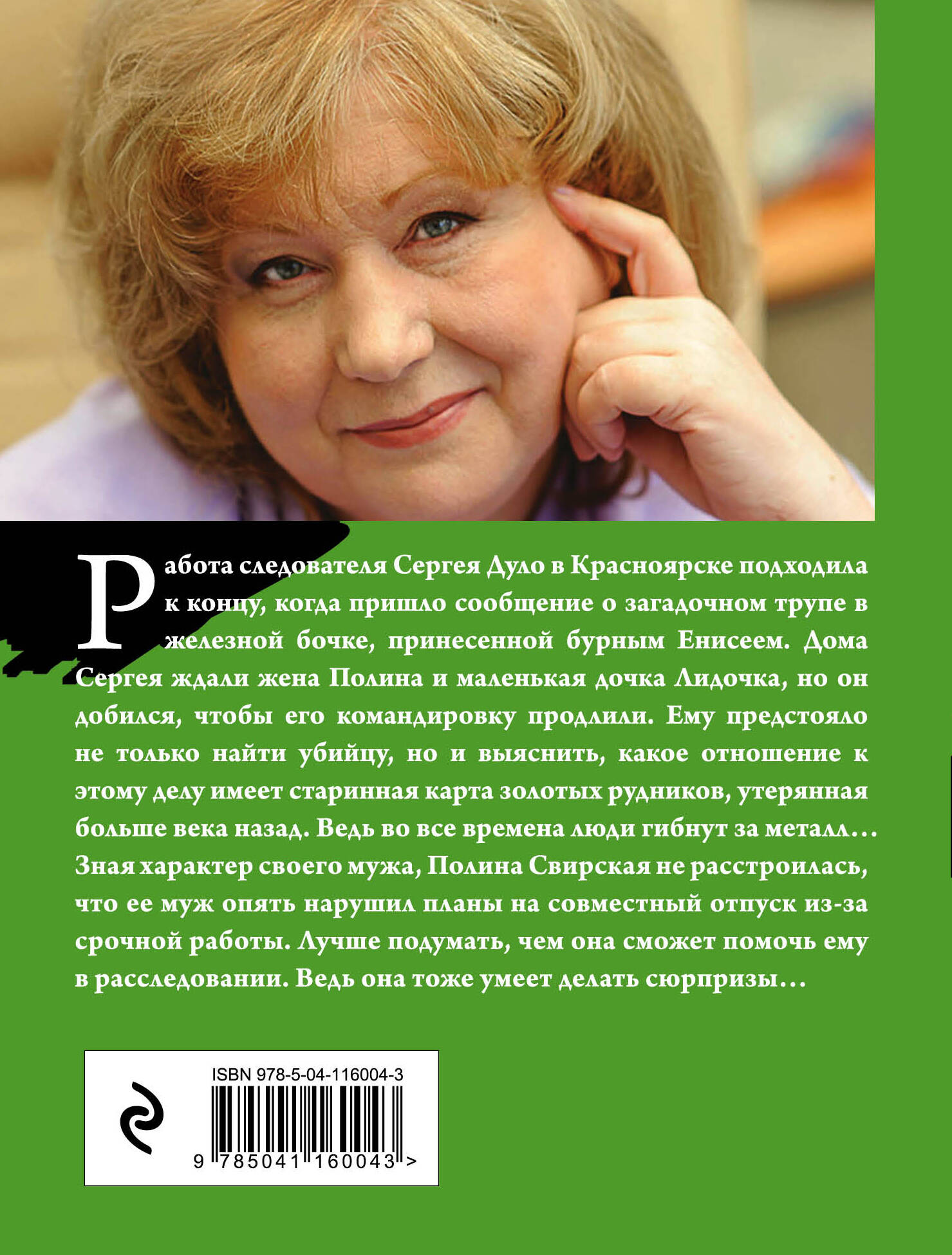 Работа следователя Сергея Дуло в Красноярске подходила к концу, когда пришло сообщение о загадочном трупе в железной бочке, принесенной бурным Енисеем. Дома Сергея ждали жена Полина и маленькая дочка Лидочка, но он добился, чтобы его командировку продлили. Ему предстояло не только найти убийцу, но и выяснить, какое отношение к этому делу имеет старинная карта золотых рудников, утерянная больше века назад. Ведь во все времена люди гибнут за металл… Зная характер своего мужа, Полина Свирская не расстроилась, что ее муж опять нарушил планы на совместный отпуск из-за срочной работы. Лучше подумать, чем она сможет помочь ему в расследовании. Ведь она тоже умеет делать сюрпризы… В остросюжетных романах Анны Князевой расследуются преступления, следы которых уводят в прошлое и позволяют пролить свет на его загадки. Вслед за героями вы отправитесь навстречу старинным тайнам и увлекательным приключениям!| Издательство | ООО "Издательство "Эксмо" |