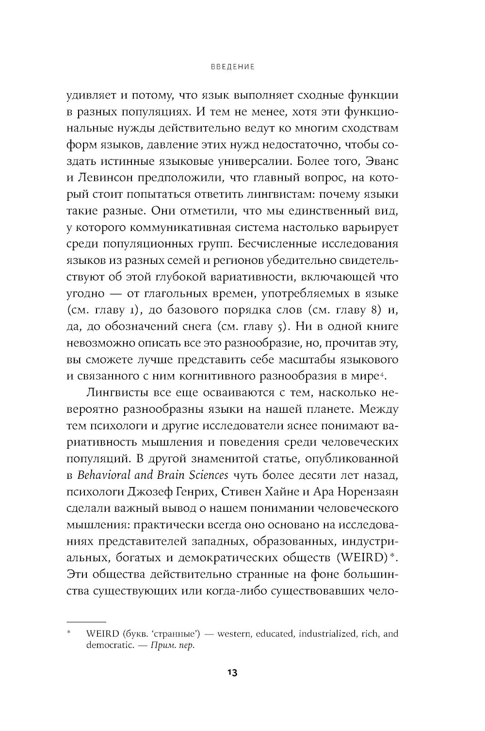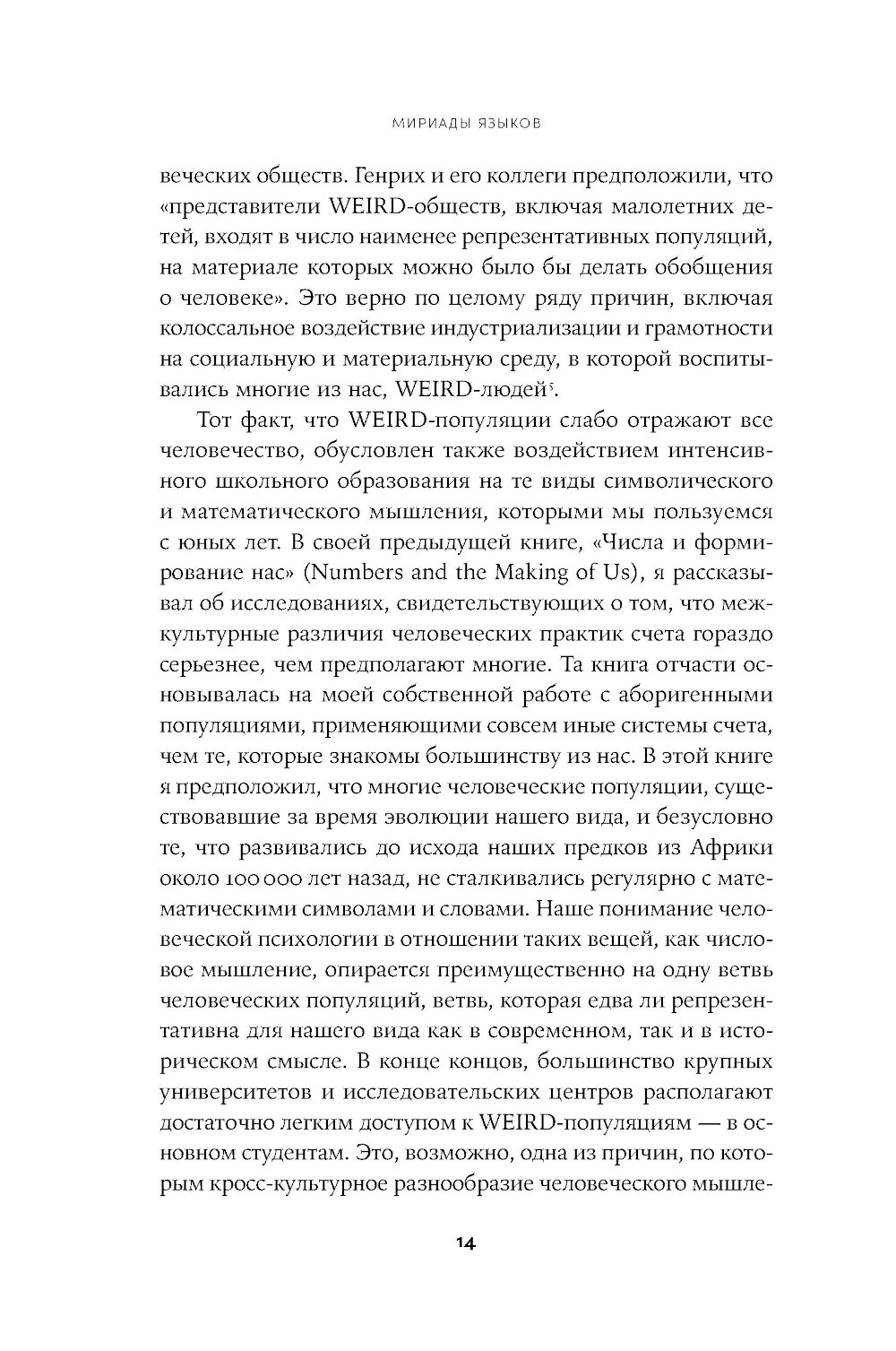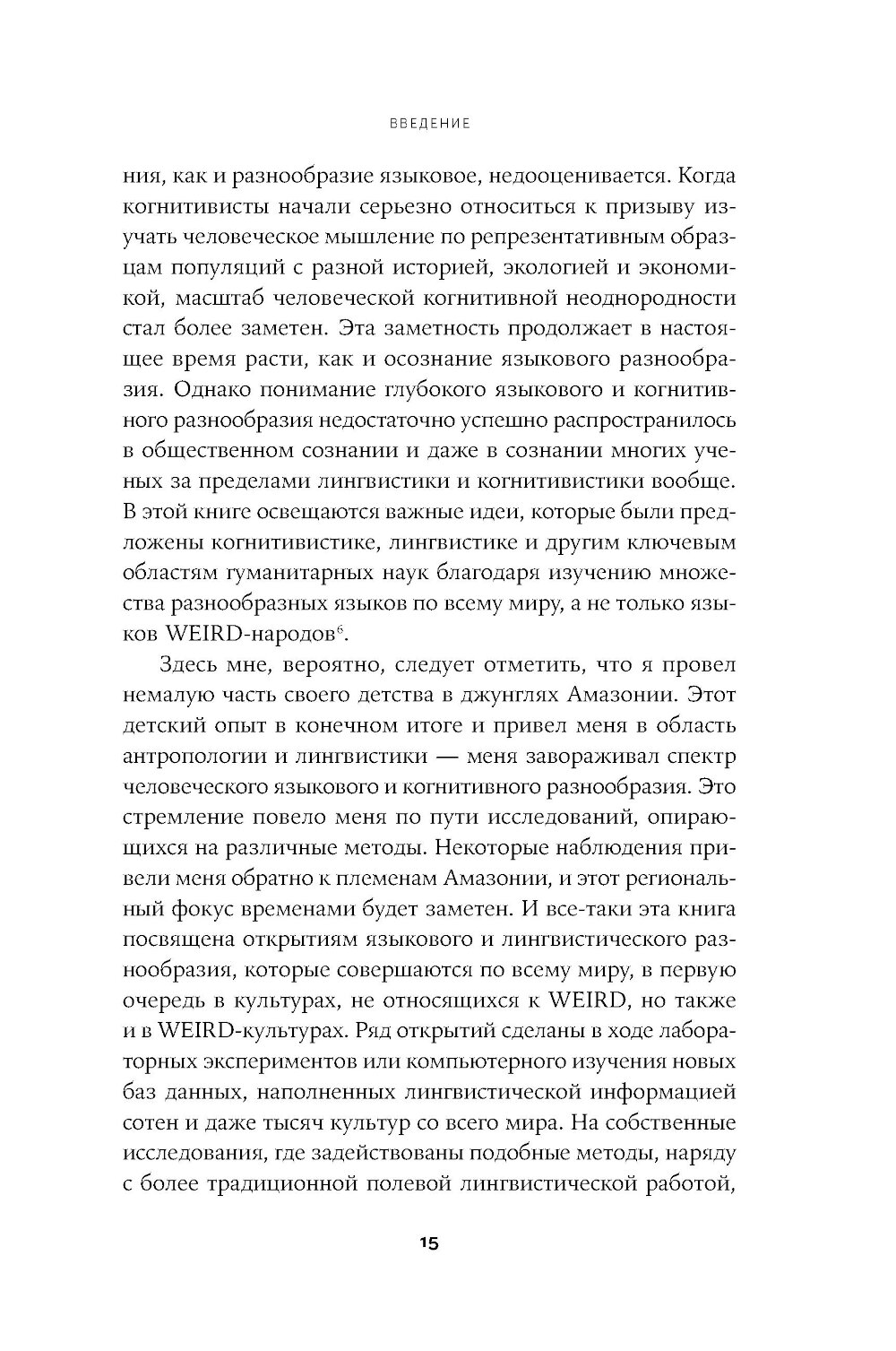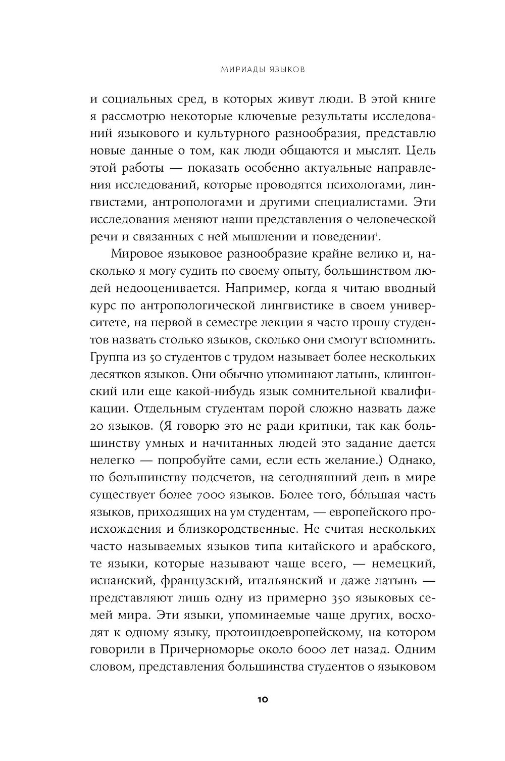 Книга представляет собой увлекательное путешествие по языковому разнообразию мира, из которого можно узнать, как именно язык отражает и формирует человеческое мышление. Опираясь на новейшие лингвистические исследования, автор показывает различия, с которыми языки кодируют базовые понятия, такие как время, пространство, цвет, запах. Изучение редких языков дает возможность по-новому подходить к вопросам человеческого познания, шире воспринимать взаимовлияние языков и культур. Языки предстают перед нами гораздо более разнообразными, чем считалось раньше, - об этом говорят все результаты современных методов исследований. Эверетт сочетает научную точность и доступность изложения: сложные концепции иллюстрируются яркими примерами из разных языков мира. Главная ценность книги в том, что она обобщает новейшие открытия в лингвистике, многие из которых были сделаны при изучении редких языков малых народов. Здесь представлен свежий взгляд на фундаментальные вопросы о природе языка и человеческого познания. Книга адресована лингвистам, антропологам, психологам, а также всем, кто интересуется развитием языков и культур мира. Эверетт сочетает научную точность и доступность изложения: сложные концепции иллюстрируются яркими примерами из разных языков мира. Главная ценность книги в том, что она обобщает новейшие открытия в лингвистике, многие из которых были сделаны при изучении редких языков малых народов. Здесь представлен свежий взгляд на фундаментальные вопросы о природе языка и человеческого познания.| Издательство | Альпина нон-фикшн |