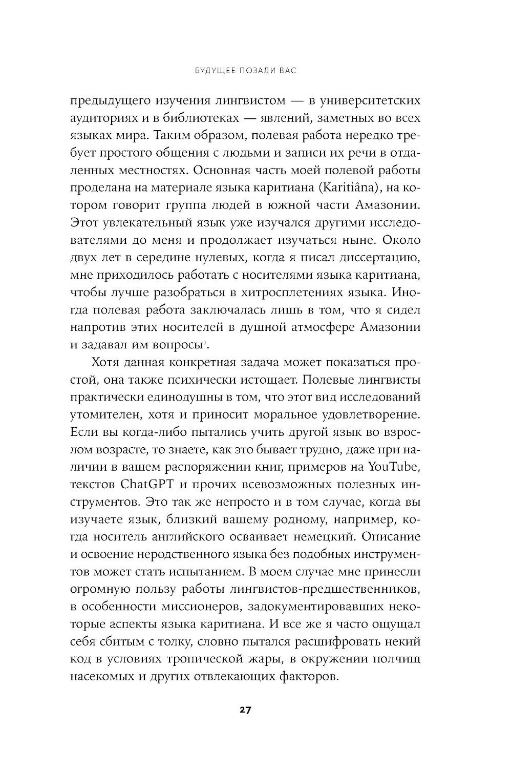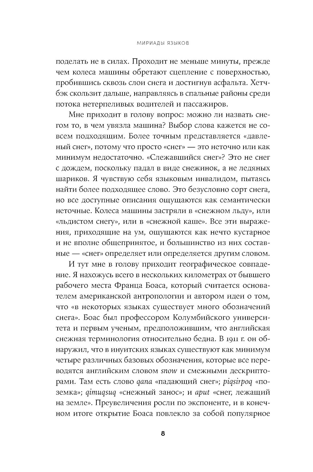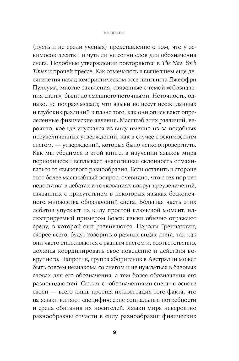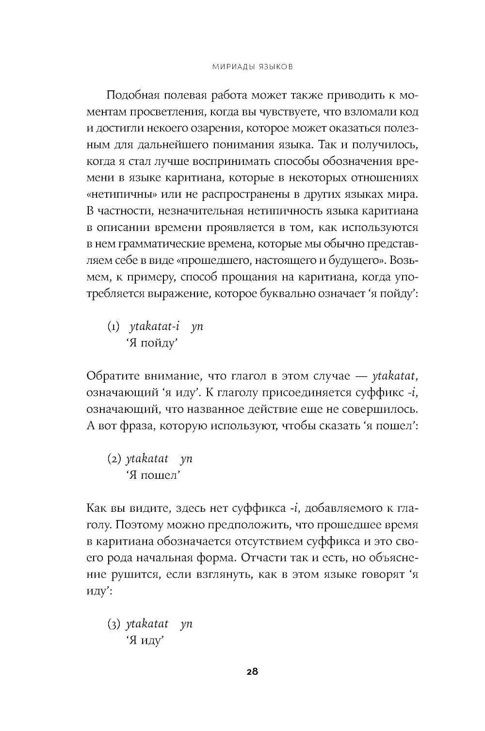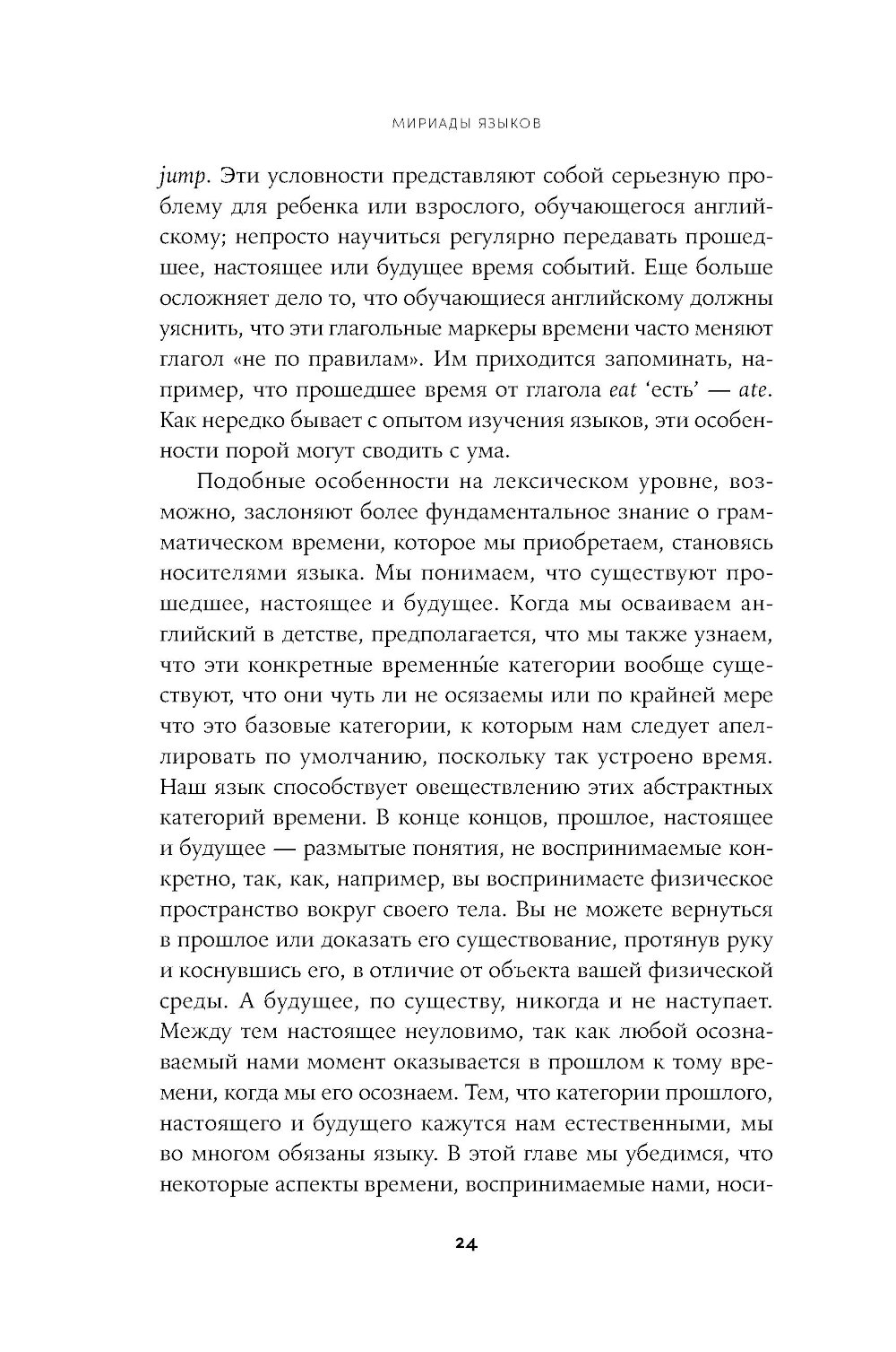 Книга представляет собой увлекательное путешествие по языковому разнообразию мира, из которого можно узнать, как именно язык отражает и формирует человеческое мышление. Опираясь на новейшие лингвистические исследования, автор показывает различия, с которыми языки кодируют базовые понятия, такие как время, пространство, цвет, запах. Изучение редких языков дает возможность по-новому подходить к вопросам человеческого познания, шире воспринимать взаимовлияние языков и культур. Языки предстают перед нами гораздо более разнообразными, чем считалось раньше, - об этом говорят все результаты современных методов исследований. Эверетт сочетает научную точность и доступность изложения: сложные концепции иллюстрируются яркими примерами из разных языков мира. Главная ценность книги в том, что она обобщает новейшие открытия в лингвистике, многие из которых были сделаны при изучении редких языков малых народов. Здесь представлен свежий взгляд на фундаментальные вопросы о природе языка и человеческого познания. Книга адресована лингвистам, антропологам, психологам, а также всем, кто интересуется развитием языков и культур мира. Эверетт сочетает научную точность и доступность изложения: сложные концепции иллюстрируются яркими примерами из разных языков мира. Главная ценность книги в том, что она обобщает новейшие открытия в лингвистике, многие из которых были сделаны при изучении редких языков малых народов. Здесь представлен свежий взгляд на фундаментальные вопросы о природе языка и человеческого познания.| Издательство | Альпина нон-фикшн |