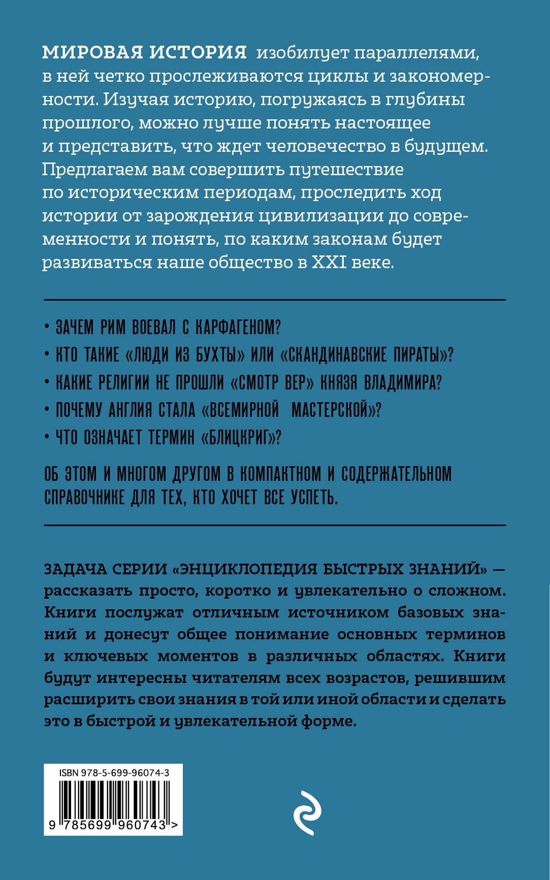 О книге: Мировая история изобилует параллелями, в ней четко прослеживаются циклы и закономерности. Изучая историю, погружаясь в глубины прошлого, можно лучше понять настоящее и представить, что ждет человечество в будущем. Предлагаем вам совершить путешествие по историческим периодам, проследить ход истории от зарождения цивилизации до современности, и понять, по каким законам будет развиваться наше общество в 21 веке. О серии: Задача серии «Энциклопедия быстрых знаний» - рассказать просто, коротко и увлекательно о сложном. Книги послужат отличным источником базовых знаний и донесут общее понимание основных терминов и ключевых моментов в различных областях. Книги будут интересны читателям всех возрастов, решившим расширить свои знания в той или иной области и сделать это в быстрой и увлекательной форме.| Издательство | ООО "Издательство "Эксмо" |