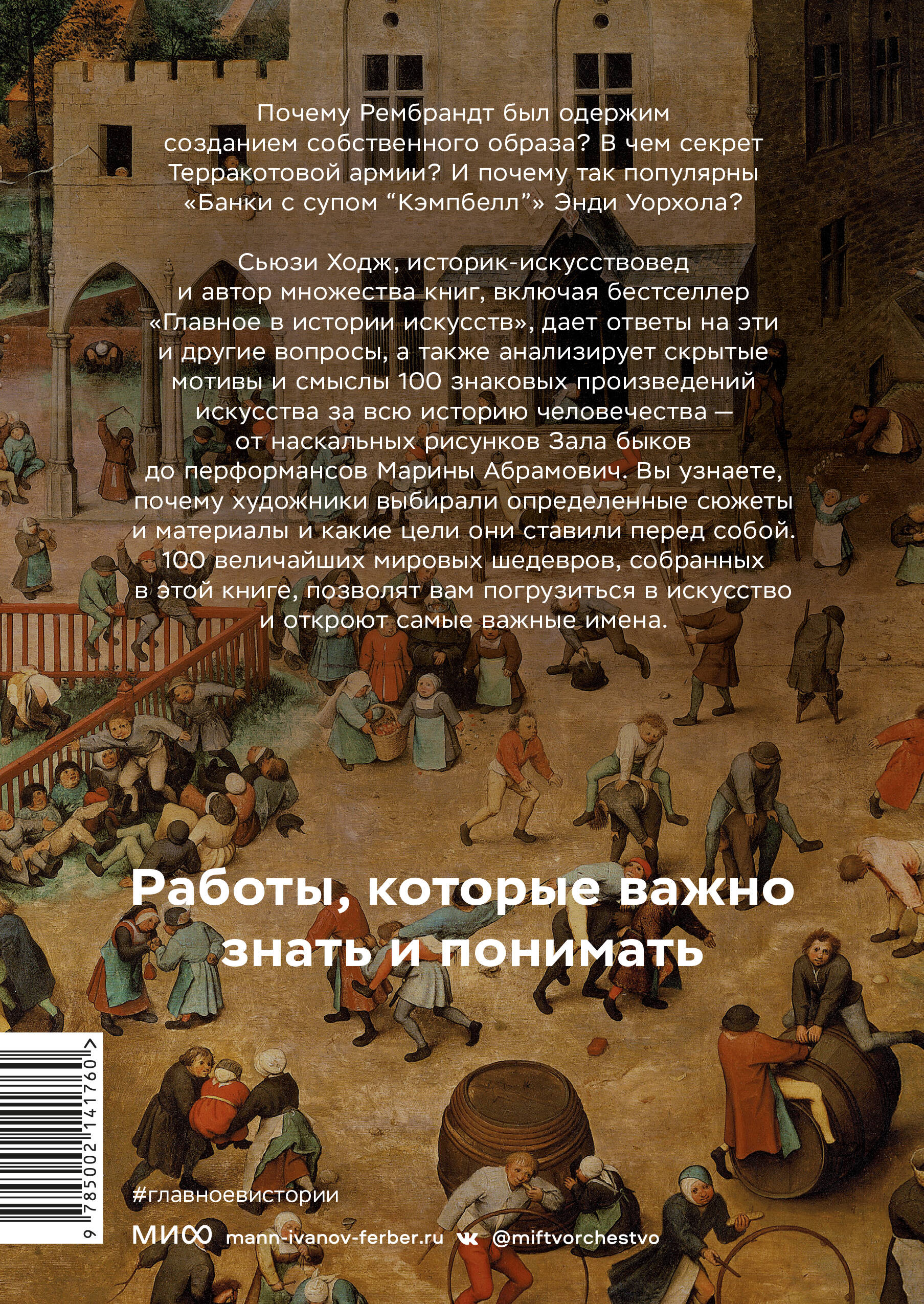 Новинка от Сьюзи Ходж, автора многих книг нашей серии "Главное в истории...". Гид по 100 самым значимым произведениям мирового искусства и их толкование. Почему Микеланджело расписал Сикстинскую капеллу, а Рембрандт был одержим созданием собственного образа? В чем секрет терракотовой армии? И почему так популярны "Банки с супом "Кэмпбелл"" Энди Уорхола? Книга предлагает ёмкие и исчерпывающие ответы на эти и другие вопросы. С ней вы раскроете секреты 100 из самых знаковых произведений мирового искусства и узнаете мотивы и толкования авторского замысла. Если вы когда-либо смотрели на шедевр искусства с трепетом, но задавались вопросом, что он означает, книга поможет вам найти ответ. От автора В этой книге мы рассмотрим сто совершенно разных произведений искусства. Некоторые их них широко известны, другие чуть менее узнаваемы, но мы исследуем их все на предмет того, где, почему, когда и как они были созданы. Все представленные здесь произведения искусства - от самых ранних из известных нам до созданных совсем недавно - по-своему удивительны, и эта книга анализирует значение и множественные толкования авторского замысла, уделяя при этом внимание происхождению, опыту и убеждениям художников, причинам, по которым они выбирали те или иные материалы, целям, которые они перед собой ставили, и обществу, в котором они жили. Если вам случалось смотреть на произведение искусства и задаваться вопросом "Как это вообще понимать?", - эта книга даст вам ответ. Искусство способно раздражать, отравлять душу, поднимать настроение, вызывать ностальгию, волновать, забавлять - на что оно только не способно! Но чаще всего оно интригует, завораживает и утешает. Без него мир был бы куда более унылым местом. Путь произведения до момента, когда автор закончил работать над ним и представил его публике, часто оказывается увлекательным и захватывающим, и эта книга поможет вам лучше понимать искусство и наслаждаться им еще больше. Для кого эта книга: Для поклонников серии Главное в истории. Для всех, кто интересуется искусством.