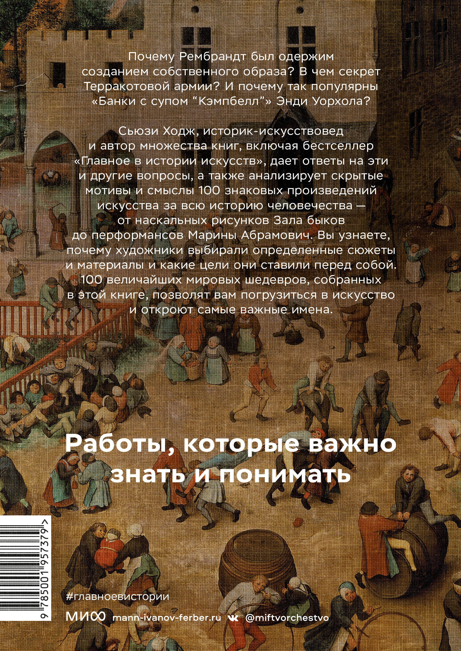 Новинка от Сьюзи Ходж, автора многих книг нашей серии "Главное в истории...". Гид по 100 самым значимым произведениям мирового искусства и их толкование. Почему Микеланджело расписал Сикстинскую капеллу, а Рембрандт был одержим созданием собственного образа? В чем секрет терракотовой армии? И почему так популярны "Банки с супом "Кэмпбелл"" Энди Уорхола? Книга предлагает ёмкие и исчерпывающие ответы на эти и другие вопросы. С ней вы раскроете секреты 100 из самых знаковых произведений мирового искусства и узнаете мотивы и толкования авторского замысла. Если вы когда-либо смотрели на шедевр искусства с трепетом, но задавались вопросом, что он означает, книга поможет вам найти ответ. От автора: В этой книге мы рассмотрим сто совершенно разных произведений искусства. Некоторые их них широко известны, другие чуть менее узнаваемы, но мы исследуем их все на предмет того, где, почему, когда и как они были созданы. Все представленные здесь произведения искусства - от самых ранних из известных нам до созданных совсем недавно - по-своему удивительны, и эта книга анализирует значение и множественные толкования авторского замысла, уделяя при этом внимание происхождению, опыту и убеждениям художников, причинам, по которым они выбирали те или иные материалы, целям, которые они перед собой ставили, и обществу, в котором они жили. Если вам случалось смотреть на произведение искусства и задаваться вопросом "Как это вообще понимать?", - эта книга даст вам ответ. <...> Искусство способно раздражать, отравлять душу, поднимать настроение, вызывать ностальгию, волновать, забавлять - на что оно только не способно! Но чаще всего оно интригует, завораживает и утешает. Без него мир был бы куда более унылым местом. Путь произведения до момента, когда автор закончил работать над ним и представил его публике, часто оказывается увлекательным и захватывающим, и эта книга поможет вам лучше понимать искусство и наслаждаться им еще больше. Для кого эта книга: Для поклонников серии "Главное в истории...". Для всех, кто интересуется искусством.| Издательство | МАНН, ИВАНОВ И ФЕРБЕР ООО |