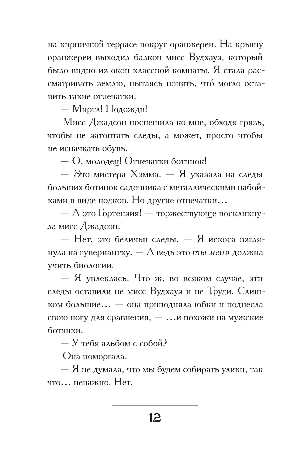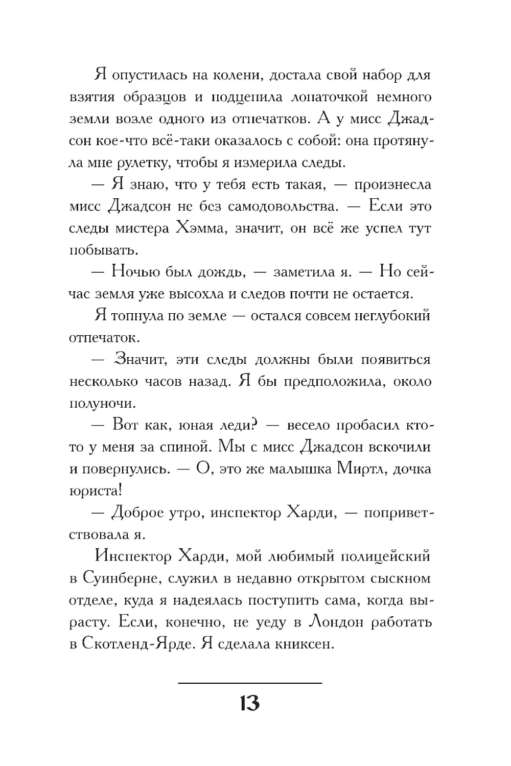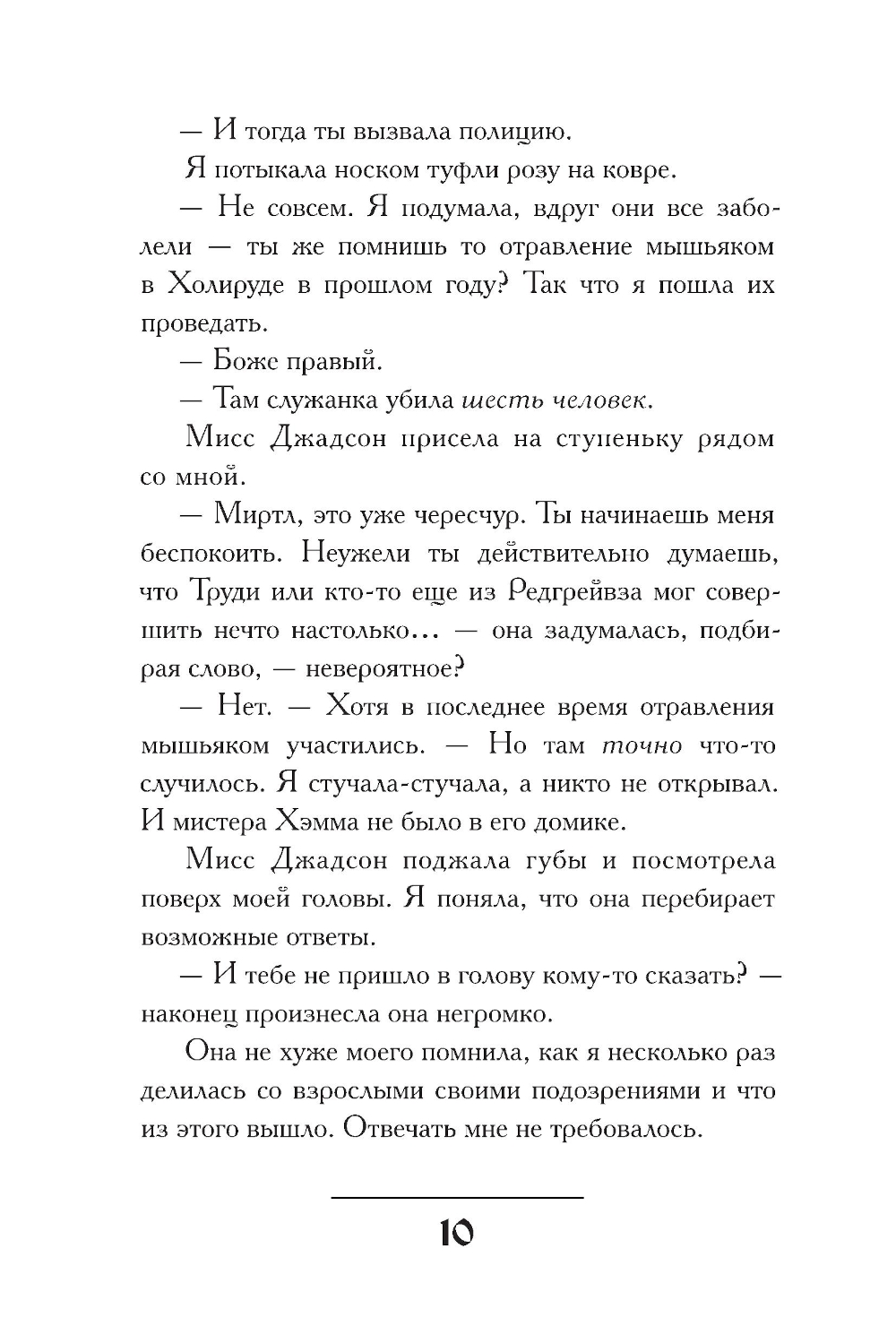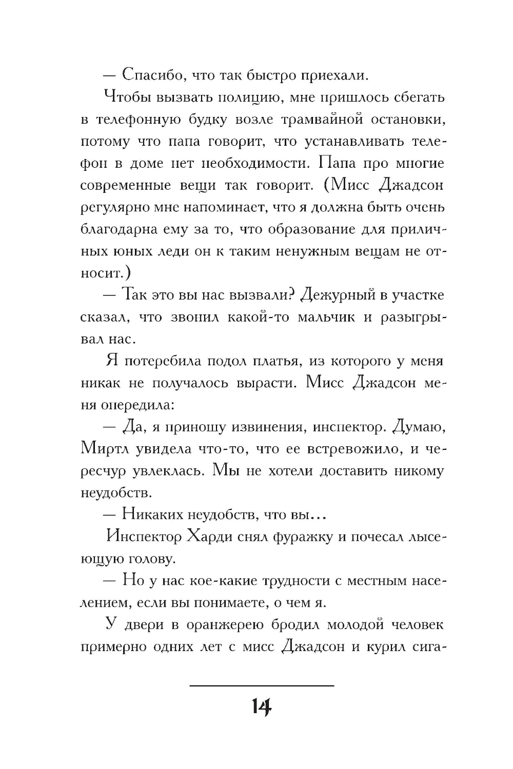 Миртл Хардкасл всего двенадцать. Она не борется за звание Благовоспитанной Юной Леди, пренебрегает светскими мероприятиями и чтением газет для девочек, отдавая предпочтение учебнику по токсикологии и полицейским сводкам. И как может быть по-другому, если ее отец - городской прокурор? Миртл убеждена, что в доме, где живет пожилая мисс Вудхауз, сегодня ночью произошло ужасное преступление. Девочка начинает свое расследование, и первая загадка на ее пути - пропажа лилий, выращиванию которых старушка отдавала все силы.| Издательство | Пять четвертей |