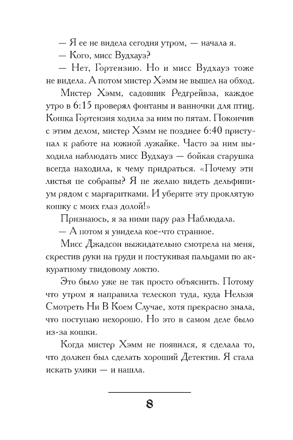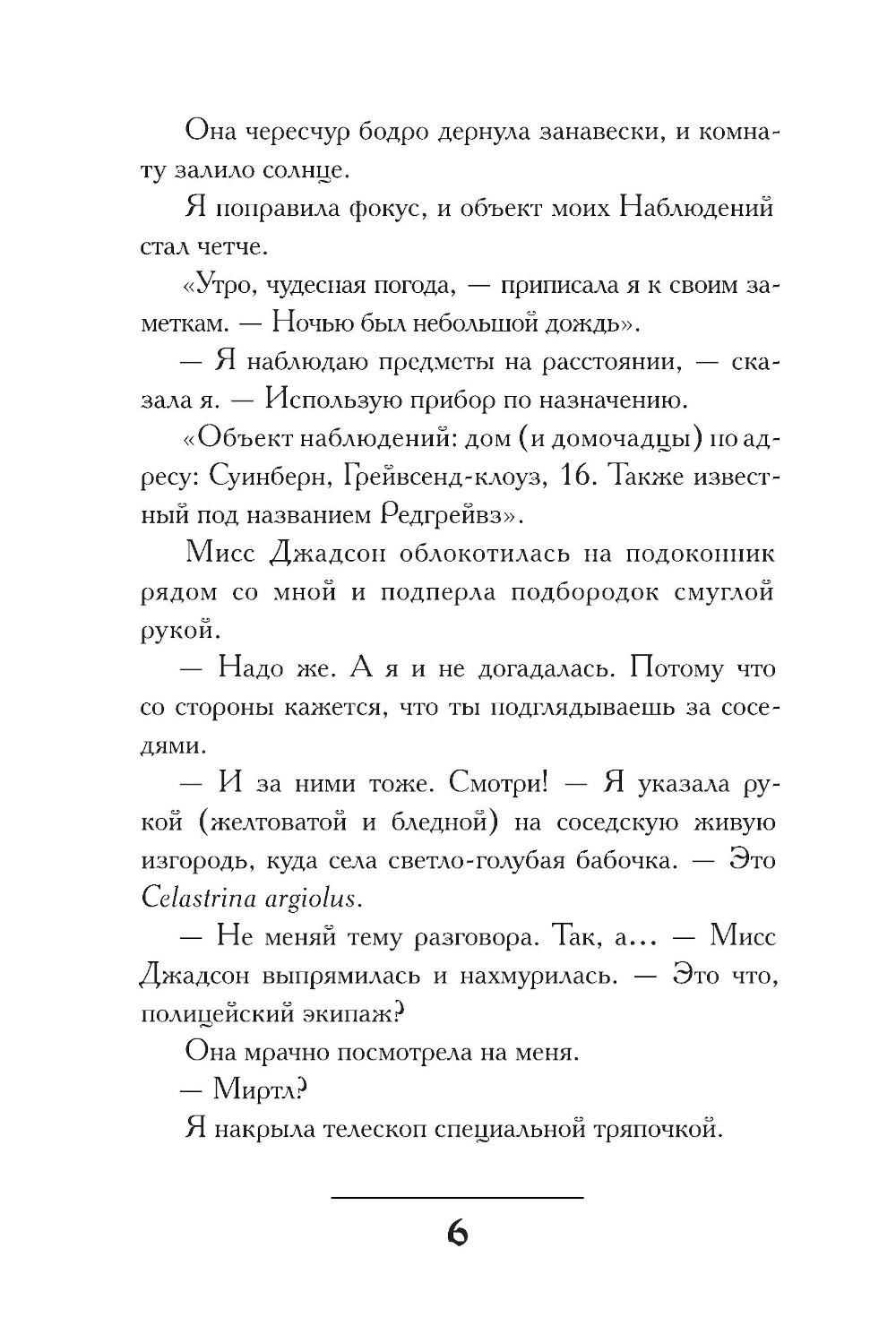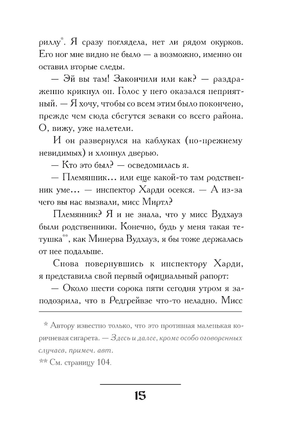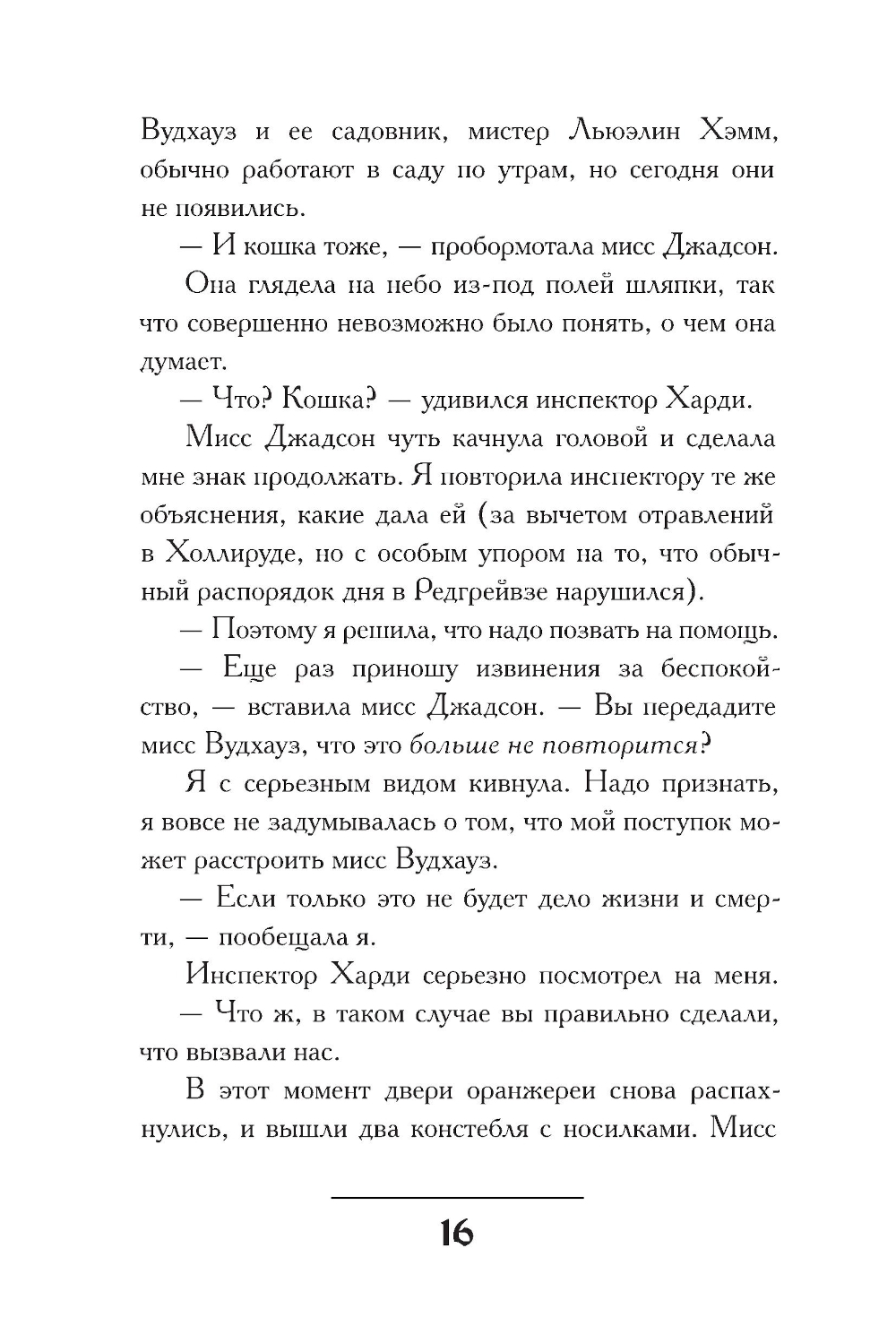 Миртл Хардкасл всего двенадцать. Она не борется за звание Благовоспитанной Юной Леди, пренебрегает светскими мероприятиями и чтением газет для девочек, отдавая предпочтение учебнику по токсикологии и полицейским сводкам. И как может быть по-другому, если ее отец - городской прокурор? Миртл убеждена, что в доме, где живет пожилая мисс Вудхауз, сегодня ночью произошло ужасное преступление. Девочка начинает свое расследование, и первая загадка на ее пути - пропажа лилий, выращиванию которых старушка отдавала все силы.| Издательство | Пять четвертей |