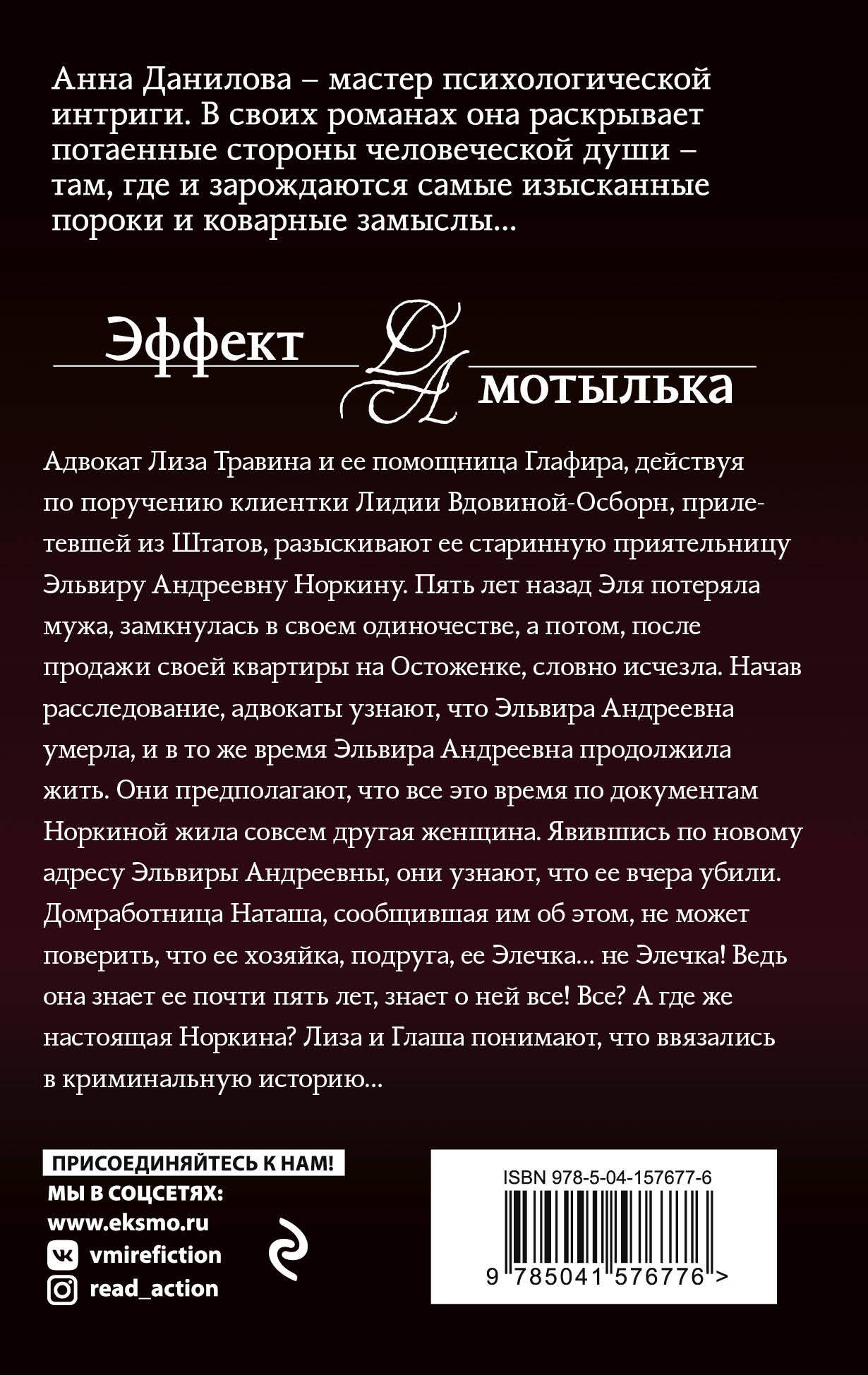 Адвокат Лиза Травина и ее помощница Глафира, действуя по поручению клиентки Лидии Вдовиной-Осборн, прилетевшей из Штатов, разыскивают ее старинную приятельницу Эльвиру Андреевну Норкину. Пять лет назад Эля потеряла мужа, замкнулась в своем одиночестве, а потом, после продажи своей квартиры на Остоженке, словно исчезла. Начав расследование, адвокаты узнают, что Эльвира Андреевна умерла, и в то же время Эльвира Андреевна продолжила жить. Они предполагают, что все это время по документам Норкиной жила совсем другая женщина. Явившись по новому адресу Эльвиры Андреевны, они узнают, что ее вчера убили. Домработница Наташа, сообщившая им об этом, не может поверить, что ее хозяйка, подруга, ее Элечка… не Элечка! Ведь она знает ее почти пять лет, знает о ней всё! Всё? А где же настоящая Норкина? Лиза и Глаша понимают, что ввязались в криминальную историю… Любовно-криминальные романы с элементами эротики признанного мастера психологического детектива Анны Даниловой. Суммарный тираж книг Анны Даниловой - 4,5 миллиона экземпляров!