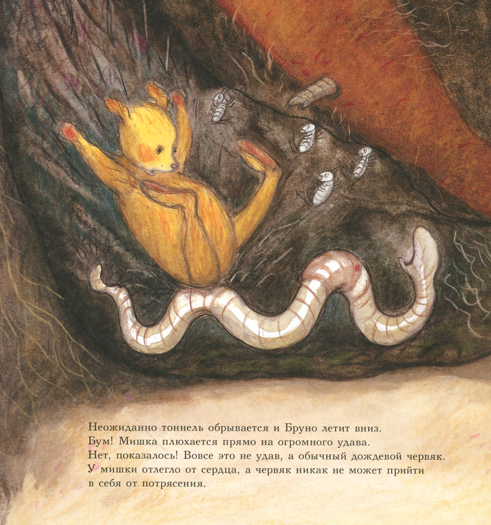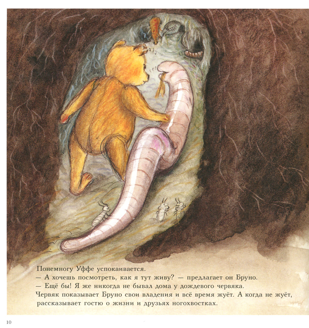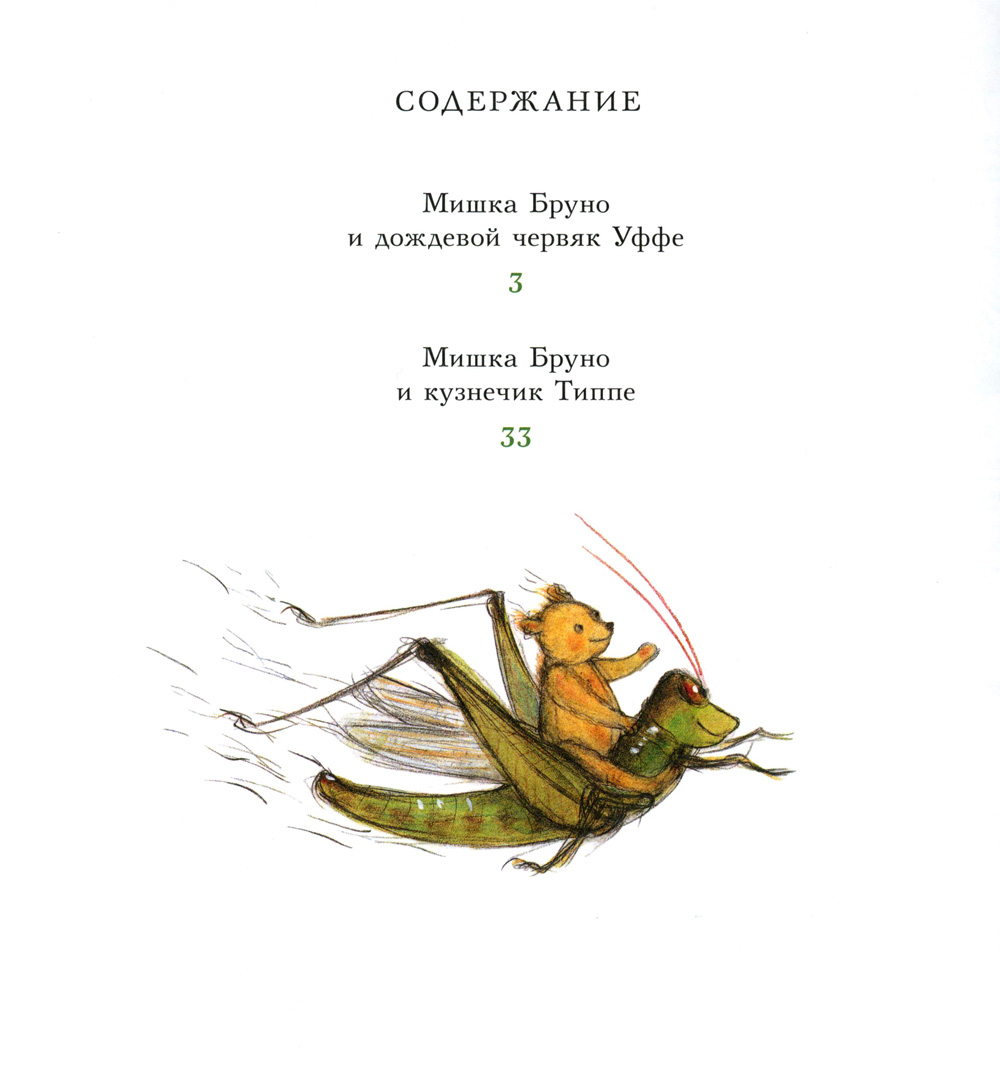 В этом сборнике мишка Бруно наблюдает за жизнью маленьких обитателей своего сада. Став крошкой, он скатывается в подземный ход, где знакомится с дождевым червяком Уффе, спасает его от свирепой многоножки и весь день проводит в его владениях. А потом встречает кузнечика Типпе, помогает ему найти невесту и устраивает у себя в саду весёлую свадьбу. И конечно, мишка Бруно не забывает вести свой дневник. Он аккуратно записывает в него всё самое интересное, что увидел во время долгих прогулок на природе.