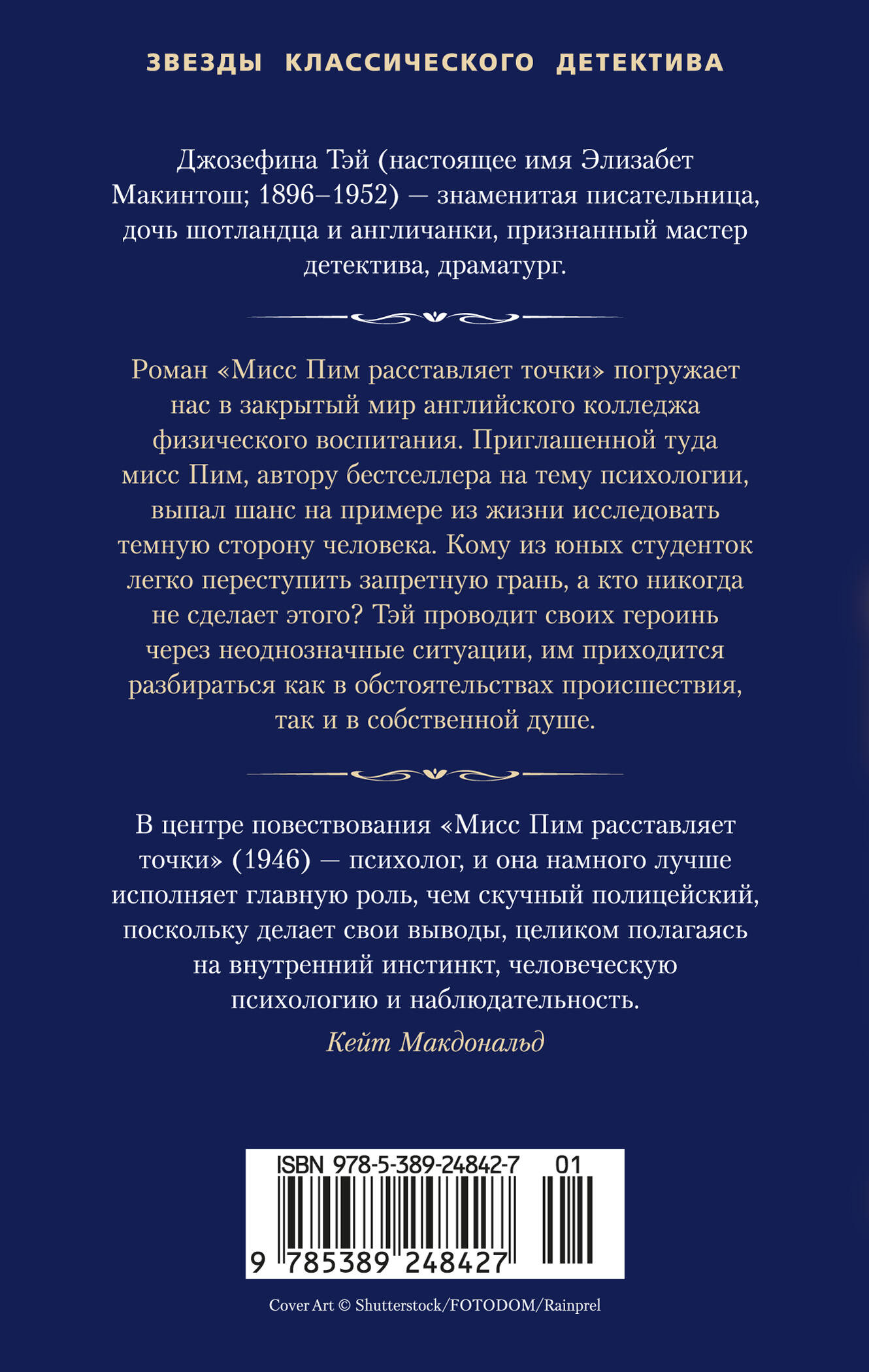 Джозефина Тэй (настоящее имя - Элизабет Макинтош; 1896-1952) - знаменитая писательница, дочь шотландца и англичанки, признанный мастер британского детектива. Роман "Мисс Пим расставляет точки" (1946) погружает нас в закрытый мир английского колледжа физического воспитания. Приглашенной туда мисс Пим, автору бестселлера на тему психологии, выпал шанс на примере из жизни исследовать темную сторону человека. Кому из юных студенток легко переступить запретную грань, а кто никогда не сделает этого? Тэй проводит своих героинь через неоднозначные ситуации, им приходится разбираться как в обстоятельствах происшествия, так и в собственной душе.| Издательство | Азбука-Аттикус Издат.группа ООО |
