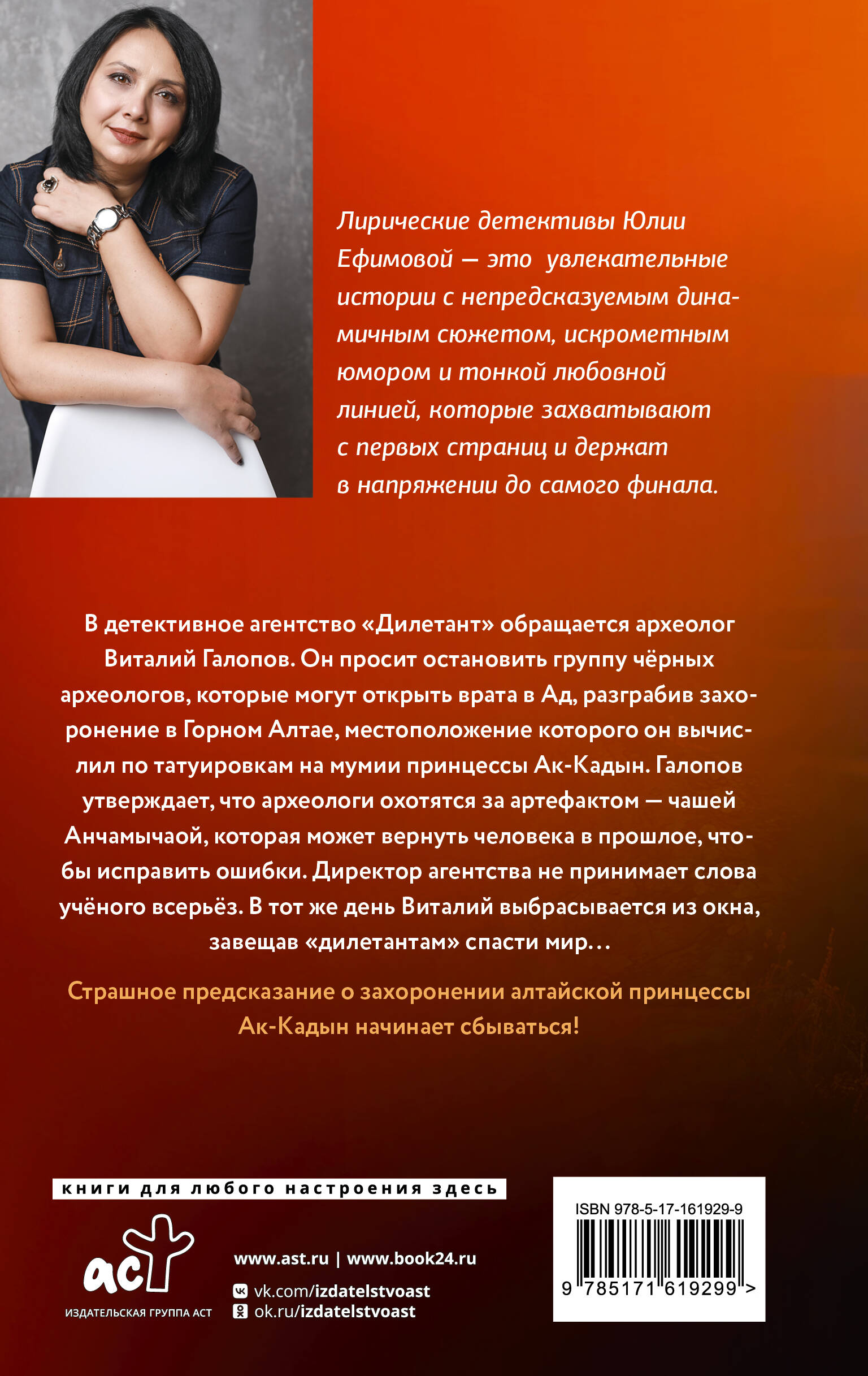 В детективное агентство "Дилетант" обращается археолог Виталий Галопов. Он просит остановить группу чёрных археологов, которые могут открыть врата в Ад, разграбив захоронение в Горном Алтае, местоположение которого он вычислил по татуировкам на мумии принцессы Ак-Кадын. Галопов утверждает, что археологи охотятся за артефактом - чашей Анчамычаой, которая может вернуть человека в прошлое, чтобы исправить ошибки. Директор агентства не принимает слова учёного всерьёз. В тот же день Виталий выбрасывается из окна, завещав "дилетантам" спасти мир…| Издательство | Издательство "АСТ" |