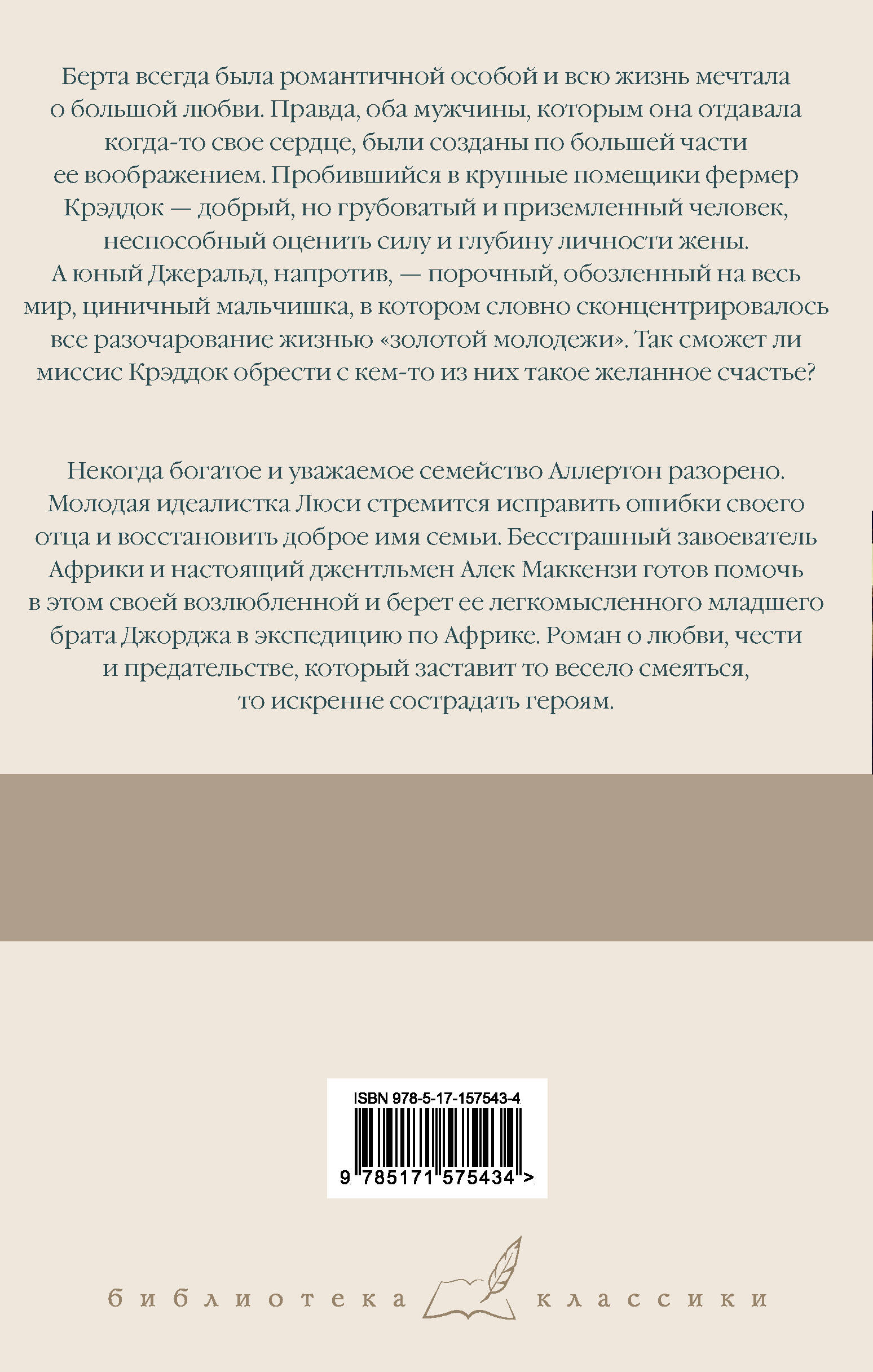 Берта всегда была романтичной особой и всю жизнь мечтала о большой любви. Правда, оба мужчины, которым она отдавала когда-то свое сердце, были созданы, по большей части, ее воображением. Пробившийся в крупные помещики фермер Крэддок - добрый, но грубоватый и приземленный человек, неспособный оценить силу и глубину личности жены. А юный Джеральд, напротив, - порочный, обозленный на весь мир, циничный мальчишка, в котором словно сконцентрировалось все разочарование жизнью "золотой молодежи". Так сможет ли миссис Крэддок обрести с кем-то из них такое желанное счастье? Некогда богатое и уважаемое семейство Аллертон разорено. Молодая идеалистка Люси стремится исправить ошибки своего отца и восстановить доброе имя семьи. Бесстрашный завоеватель Африки и настоящий джентльмен Алек Маккензи готов помочь в этом своей возлюбленной и берет ее легкомысленного младшего брата Джорджа в экспедицию по Африке. Роман о любви, чести и предательстве, который заставит то весело смеяться, то искренне сострадать героям.| Издательство | ИЗДАТЕЛЬСТВО "АСТ" |