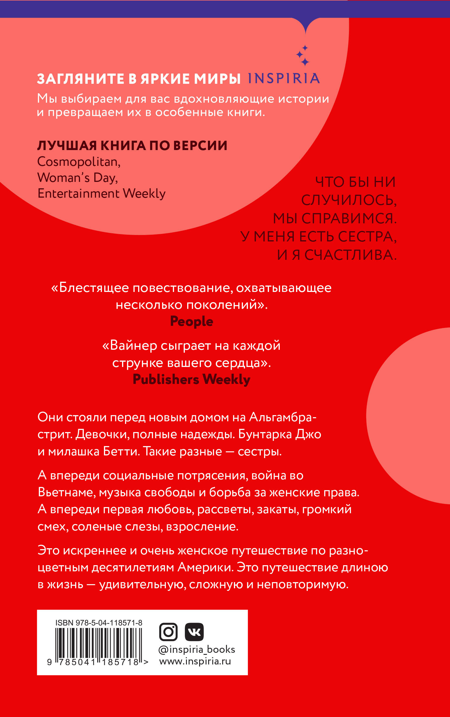 Это история двух сестер, которая начинается в 1950-х годах. Девочки взрослеют - мир меняется. Они пытаются найти свое место в жизни, пытаются быть верными себе, но, как известно, у каждого своя дорога, а настоящий дом там, где тебя ждут. Роман Дженнифер Вайнер стал бестселлером New York Times и полюбился многим читателям. Эта книга заставит вас смеяться и плакать, и, может быть, уже завтра вы решите изменить свою жизнь, переписав ее воображаемый сценарий. А еще вам очень захочется обнять того, кто всегда рядом, несмотря ни на что. Они стояли перед новым домом на Альгамбра-стрит. Девочки, полные надежды. Бунтарка Джо и милашка Бетти. Такие разные - сестры. А впереди социальные потрясения, война во Вьетнаме, музыка свободы и борьба за женские права. А впереди первая любовь, рассветы, закаты, громкий смех, соленые слезы, взросление. Это искреннее и очень женское путешествие по разноцветным десятилетиям Америки. Это путешествие длиною в жизнь - удивительную, сложную и неповторимую. «Если у вас есть время только на одну книгу, выберите эту». New York Times Book Review «Блестящее повествование, охватывающее несколько поколений». People «Вайнер сыграет на каждой струнке вашего сердца». Publishers Weekly| Издательство | ООО "Издательство "Эксмо" |