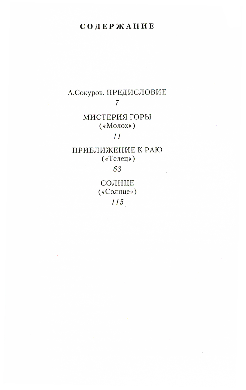 В этот сборник вошли избранные сценарии Ю. Н. Арабова: "Мистерия горы" (1999), отмеченный премией жюри Каннского кинофестиваля, по которому режиссер А. Н. Со куров снял фильм "Молох"; "Приближение к раю" (2006), за который автор отмечен Государственной премией РФ, положенный в основу фильма "Телец"; и "Солнце" (2005), экранизированный в том же году.
