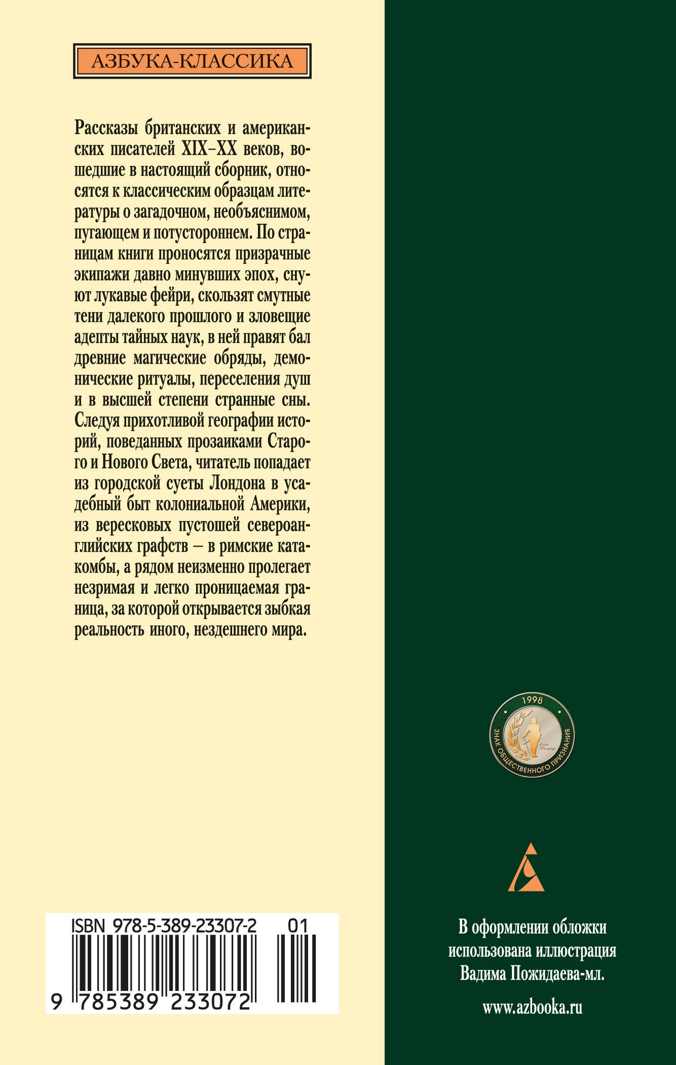 Рассказы британских и американских писателей XIX-XX веков, вошедшие в настоящий сборник, относятся к классическим образцам литературы о загадочном, необъяснимом, пугающем и потустороннем. По страницам книги проносятся призрачные экипажи давно минувших эпох, снуют лукавые фейри, скользят смутные тени далекого прошлого и зловещие адепты тайных наук, в ней правят бал древние магические обряды, демонические ритуалы, переселения душ и в высшей степени странные сны. Следуя прихотливой географии историй, поведанных прозаиками Старого и Нового Света, читатель попадает из городской суеты Лондона в усадебный быт колониальной Америки, из вересковых пустошей североанглийских графств - в римские катакомбы, а рядом неизменно пролегает незримая и легко проницаемая граница, за которой открывается зыбкая реальность иного, нездешнего мира.| Издательство | Азбука-Аттикус Издат.группа ООО |