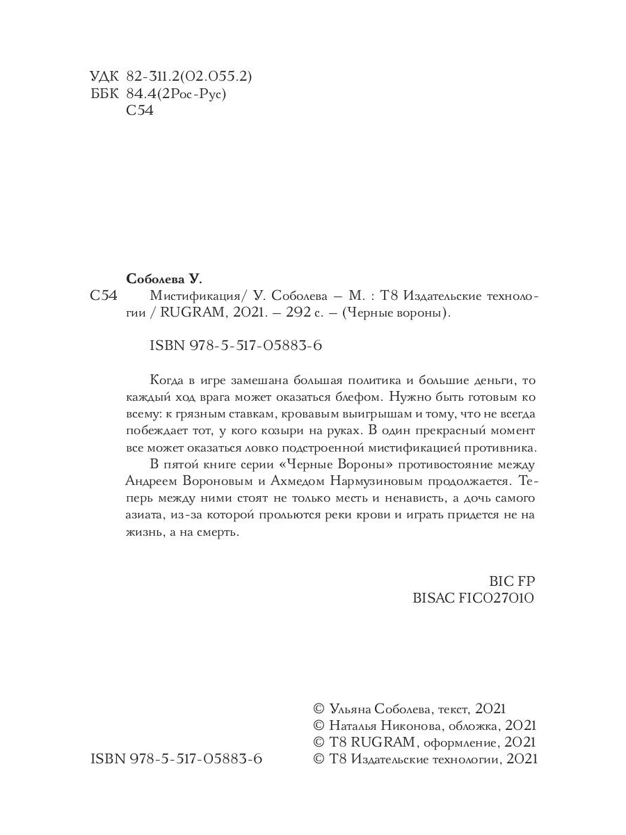 Когда в игре замешана большая политика и большие деньги, то каждый ход врага может оказаться блефом. Нужно быть готовым ко всему: к грязным ставкам, кровавым выигрышам и тому, что не всегда побеждает тот, у кого козыри на руках. В один прекрасный момент все может оказаться ловко подстроенной мистификацией противника. В пятой книге серии «Черные Вороны» противостояние между Андреем Вороновым и Ахмедом Нармузиновым продолжается. Теперь между ними стоят не только месть и ненависть, а дочь самого азиата, из-за которой прольются реки крови и играть придется не на жизнь, а на смерть.| Издательство | Т8 RUGRAM |