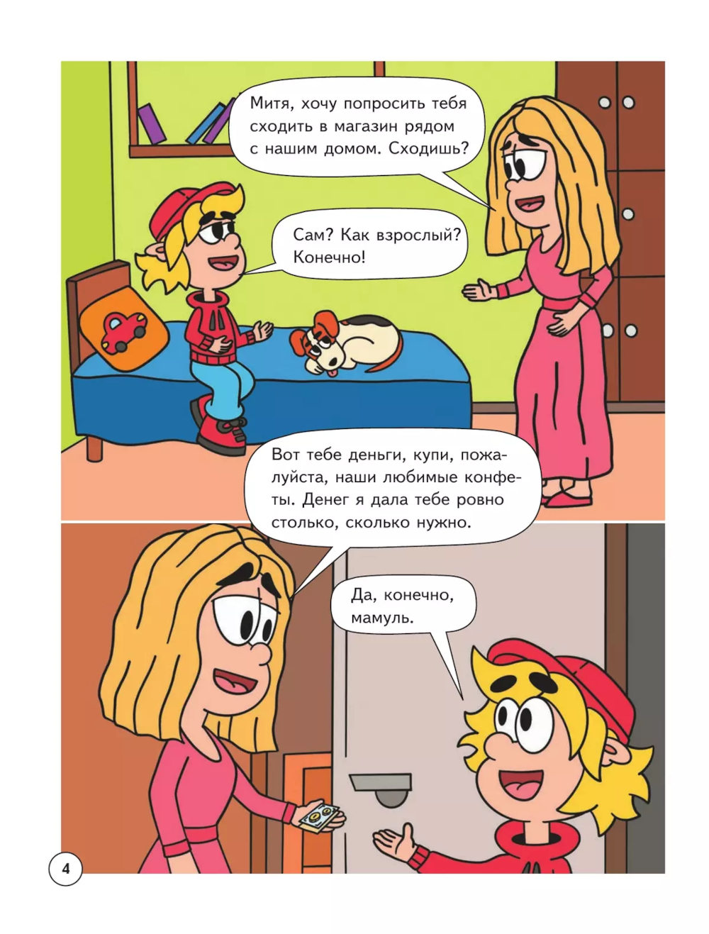 Весёлая юридическая история о мальчике Мите, который знакомит детей с ответственностью за проступки. Он попадает в поправимые неприятные ситуации в силу изначального непонимания ответственности за некоторые, на первый взгляд, невинные поступки, но благодаря своей сообразительности, и иногда при помощи взрослых, он находит решение проблем. Митя впервые идёт в магазин самостоятельно. Как конфеты могут исчезнуть с прилавка магазина? Мите предстоит узнать эту тайну.| Издательство | Просвещение |