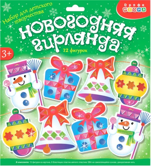 Перед вами набор для детского творчества, который поможет ребёнку самостоятельно сделать новогоднюю гирлянду и украсить дом к празднику. Гирлянда, сделанная своими руками - принесет радость творчества и станет поводом для гордости перед гостями. В наборе есть всё, что нужно для создания гирлянды: 12 фигурок из картона, блестящие самоклеящиеся детали для украшения и декоративная нить для нанизывания фигурок. Все детали аппликации уже вырезаны и готовы к работе. Нужно лишь снять с защитного слоя фрагмент и приклеить его в соответствующее место на той или иной фигурке, продеть декоративную нить. Такой гирляндой можно украсить ёлку или детскую комнату в преддверии Нового года. Игра развивает глазомер и мелкую моторику. Сделай сам свою Новогоднюю гирлянду! Подходит в качестве тематической поделки или новогоднего подарка в детском саду.