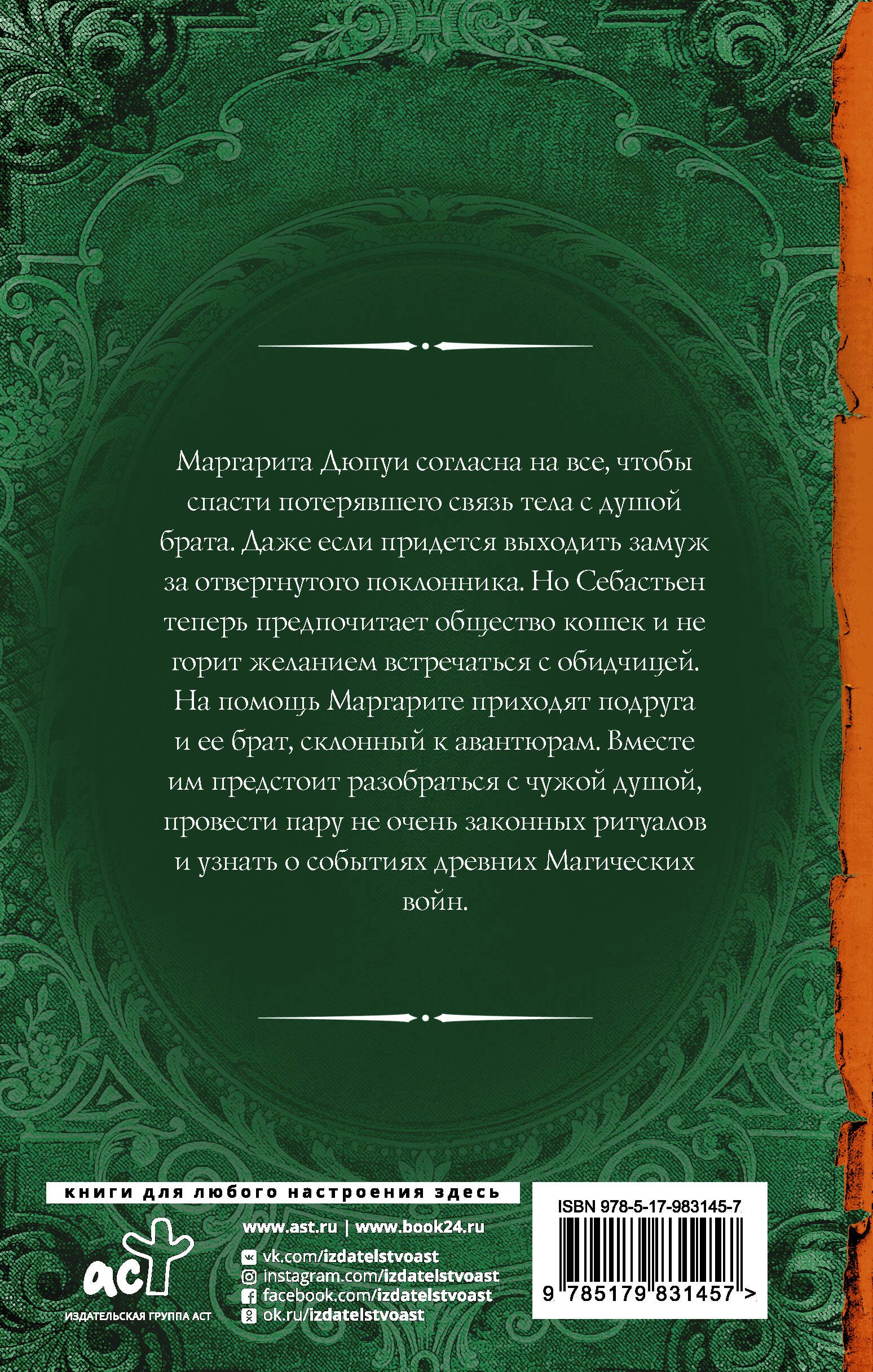 Маргарита Дюпуи согласна на все, чтобы спасти потерявшего связь тела с душой брата. Даже если придется выходить замуж за отвергнутого поклонника. Но Себастьен теперь предпочитает общество кошек и не горит желанием встречаться с обидчицей. На помощь Маргарите приходят подруга и ее брат, склонный к авантюрам. Вместе им предстоит разобраться с чужой душой, провести пару не очень законных ритуалов и узнать о событиях древних Магических войн.| Издательство | Издательство "АСТ" |