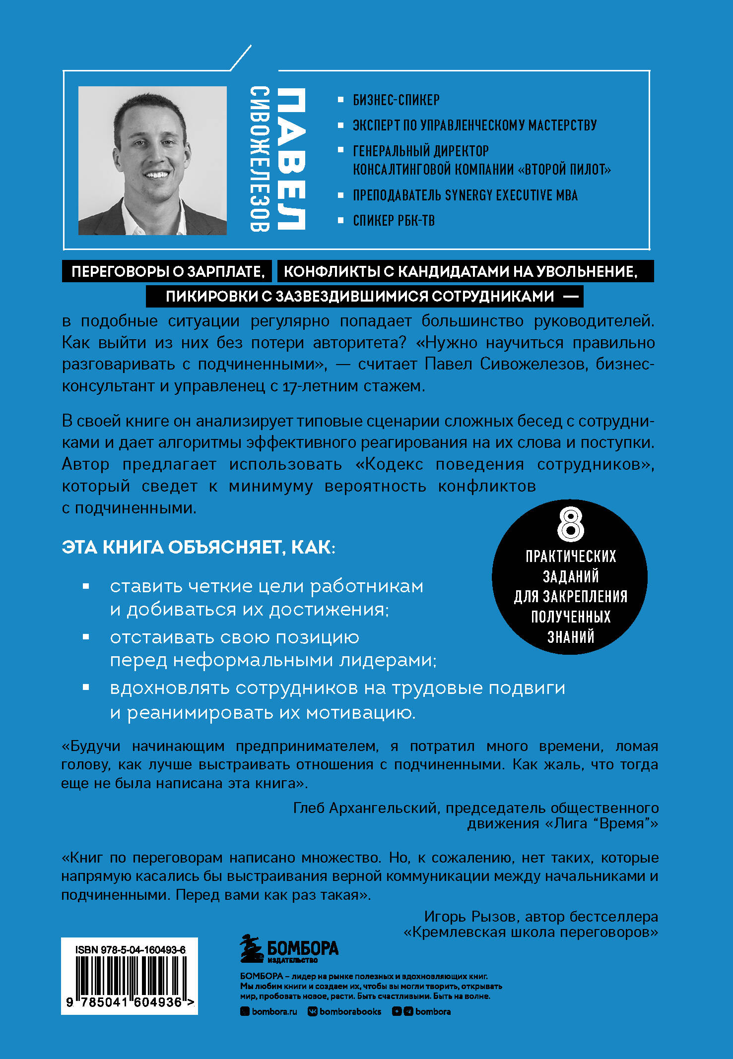 Переговоры о зарплате, конфликты с кандидатами на увольнение, пикировки с зазвездившимися сотрудниками - в подобные ситуации регулярно попадает большинство руководителей. Как выйти из них без потери авторитета? «Нужно научиться правильно разговаривать с подчиненными», - считает Павел Сивожелезов, бизнес-консультант и управленец с 17-летним стажем. В своей книге он анализирует типовые сценарии сложных бесед с сотрудниками и дает алгоритмы эффективного реагирования на их слова и поступки. Автор предлагает использовать «Кодекс поведения сотрудников», который сведет к минимуму вероятность конфликтов с подчиненными. Эта книга объясняет, как: - ставить четкие цели работникам и добиваться их достижения; - отстаивать свою позицию перед неформальными лидерами; - вдохновлять сотрудников на трудовые подвиги и реанимировать их мотивацию. + 8 практических заданий для закрепления полученных знаний. Отзывы экспертов: «Будучи начинающим предпринимателем, я потратил много времени, ломая голову, как лучше выстраивать отношения с подчиненными. Как жаль, что тогда еще не была написана эта книга». - Глеб Архангельский, председатель общественного движения «Лига "Время"» «Книг по переговорам написано множество. Но, к сожалению, нет таких, которые напрямую касались бы выстраиванию верной коммуникации между начальниками и подчиненными. Перед вами как раз такая». - Игорь Рызов, автор бестселлера «Кремлевская школа переговоров» «Готовая технология переговоров, описанная в книге, позволяет предпринимателю тратить минимум времени на сложные вопросы управления и сосредоточиться на воплощении самых смелых бизнес-идей». - Артем Артемьев, председатель Челябинского отделения «ОПОРА РОССИИ»| Издательство | Эксмо |