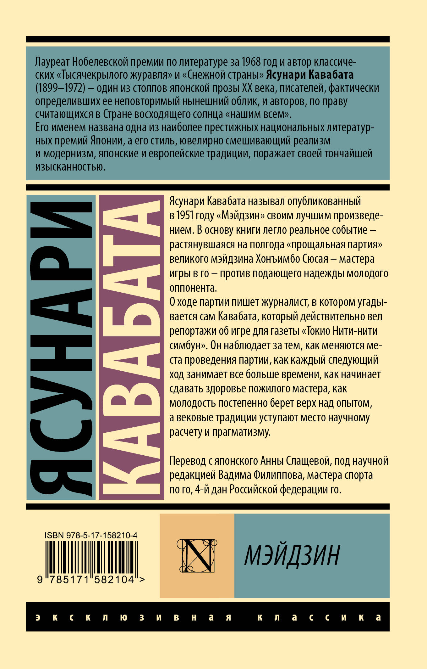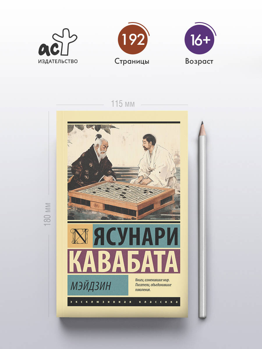 Ясунари Кавабата называл опубликованный в 1951 году "Мэйдзин" своим лучшим произведением. В основу книги легло реальное событие - растянувшаяся на полгода "прощальная партия" великого мэйдзина Хонъимбо Сюсая - мастера игры в го - против подающего надежды молодого оппонента. О ходе партии пишет журналист, в котором угадывается сам Кавабата, который действительно вел репортажи об игре для газеты "Токио Нити-нити симбун". Он наблюдает за тем, как меняются места проведения партии, как каждый следующий ход занимает все больше времени, как начинает сдавать здоровье пожилого мастера, как молодость постепенно берет верх над опытом, а вековые традиции уступают место научному расчету и прагматизму. Перевод с японского Анны Слащевой, под научной редакцией Вадима Филиппова, мастера спорта по го, 4-й дан Российской федерации го.| Издательство | Издательство "АСТ" |