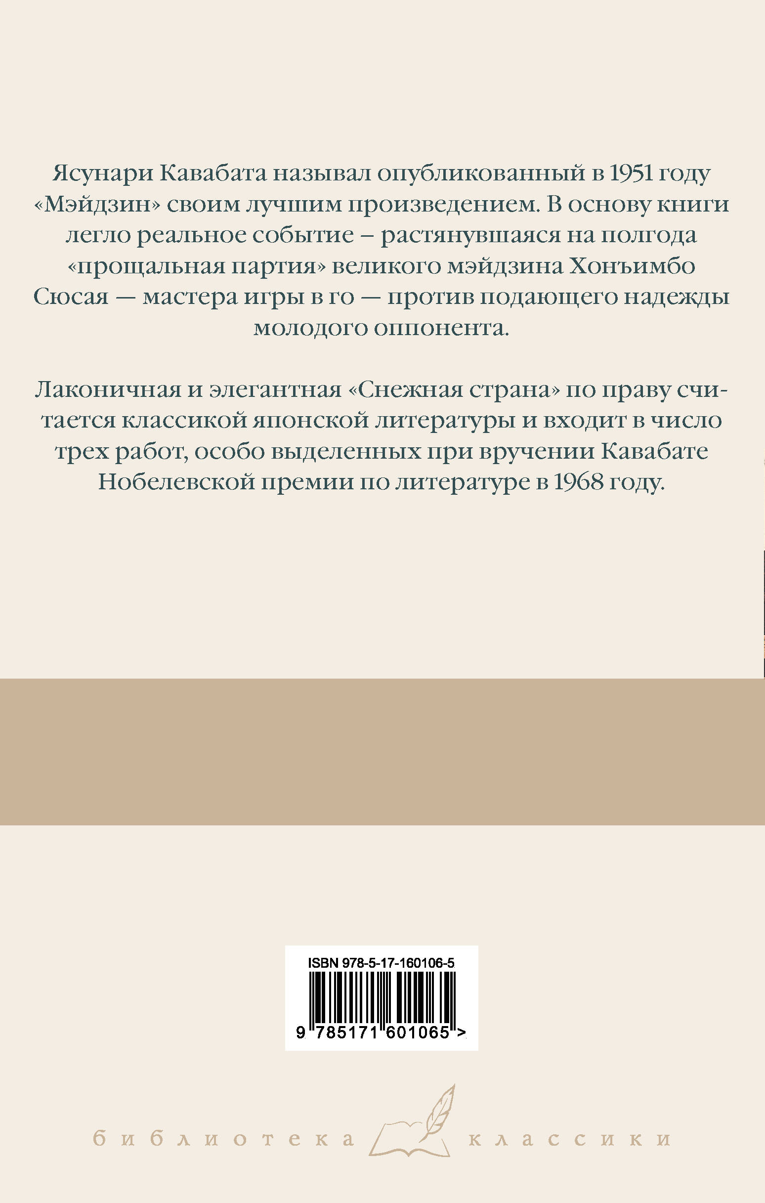 - Ясунари Кавабата - выдающийся японский классик и первый японец, удостоенный Нобелевской премии по литературе. - В данное издание вошли два романа Кавабаты. Лаконичная и элегантная «Снежная страна» вошла в число трех произведений, особо выделенных Нобелевским комитетом, а роман «Мэйдзин» называл своим лучшим произведением сам Кавабата. - Издание в серии «Библиотека классики» - в твердой обложке и строгом оформлении.| Издательство | Издательство "АСТ" |