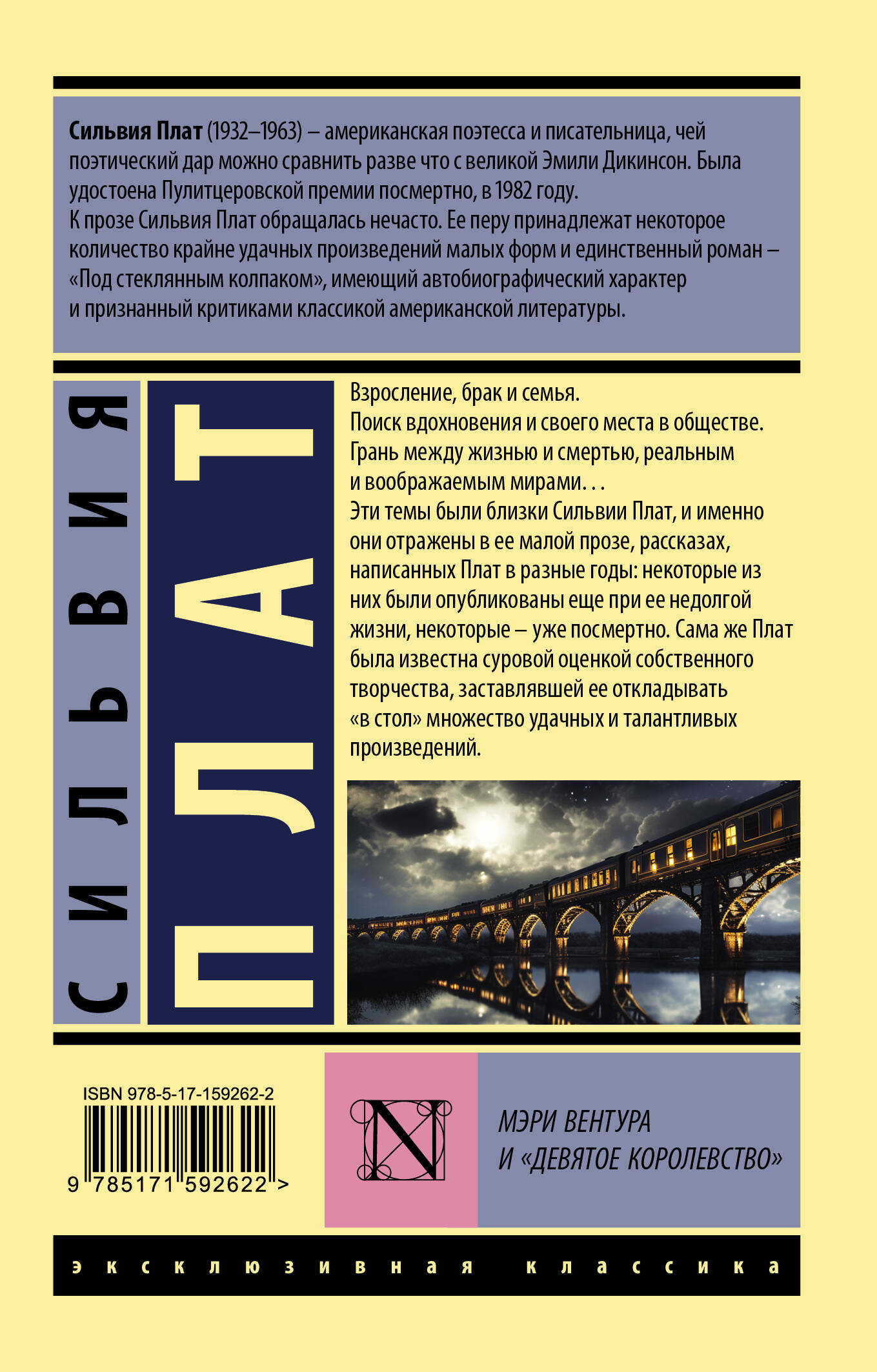 Взросление, брак и семья. Поиск вдохновения и своего места в обществе. Грань между жизнью и смертью, реальным и воображаемым мирами… Эти темы были близки Сильвии Плат, и именно они отражены в ее малой прозе, рассказах, написанных Плат в разные годы: некоторые из них были опубликованы еще при ее недолгой жизни, некоторые - уже посмертно. Сама же Плат была известна суровой оценкой собственного творчества, заставлявшей ее откладывать "в стол" множество удачных и талантливых произведений.| Издательство | Издательство "АСТ" |
