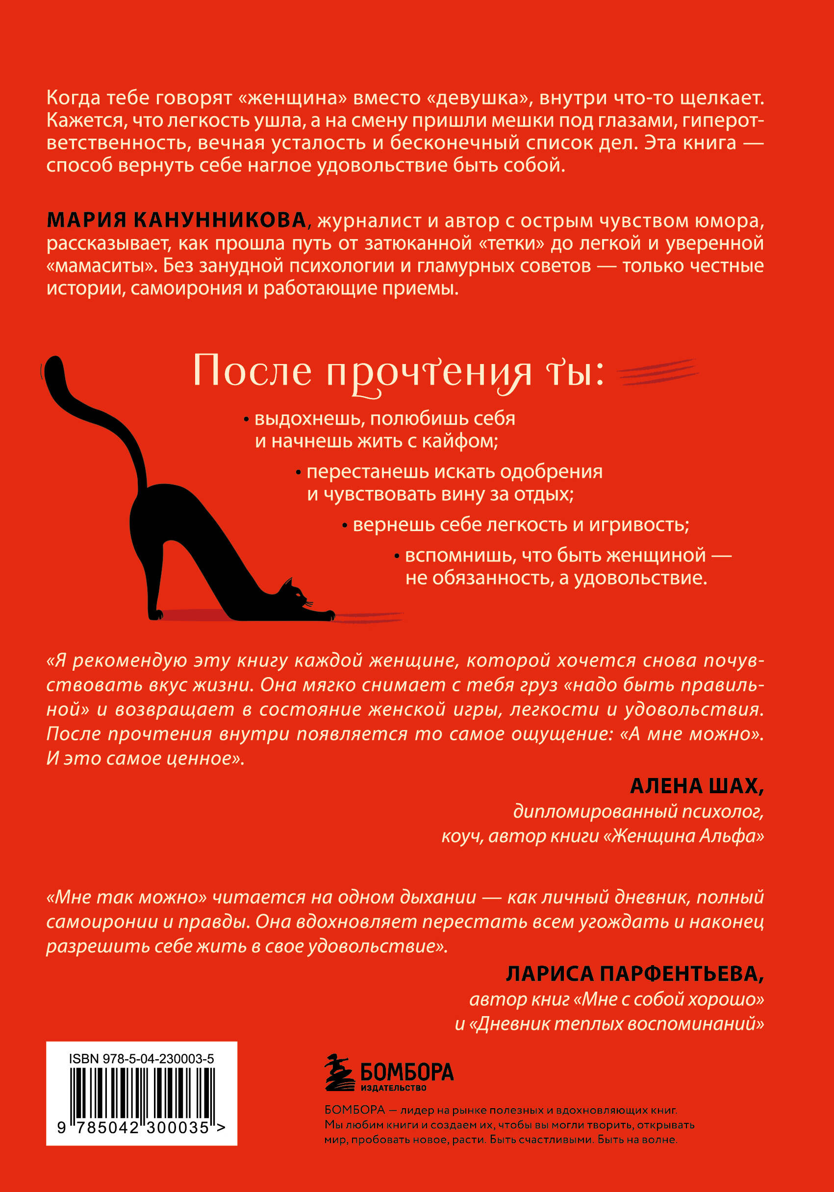 Когда тебе говорят «женщина» вместо «девушка», внутри что-то щелкает. Кажется, что легкость ушла, а на смену пришли мешки под глазами, гиперответственность, вечная усталость и бесконечный список дел. Эта книга - способ вернуть себе наглое удовольствие быть собой. Мария Канунникова, журналист и автор с острым чувством юмора, рассказывает, как прошла путь от затюканной «тетки» до легкой и уверенной «мамаситы». Без занудной психологии и гламурных советов - только честные истории, самоирония и работающие приемы. «Мне так можно» - это разрешение жить по-своему, без чувства вины и с удовольствием от каждой мелочи. Книга вошла в шорт-лист конкурса «Русский нонфик: новые имена» и побывала в ТОП-10 продаж Литрес. После прочтения ты: • вернешь себе легкость и игривость; • перестанешь искать одобрения и чувствовать вину за отдых; • выдохнешь, полюбишь себя и начнешь жить с кайфом; • вспомнишь, что быть женщиной - не обязанность, а удовольствие. Я рекомендую эту книгу каждой женщине, которой хочется снова почувствовать вкус жизни. Она мягко снимает с тебя груз «надо быть правильной» и возвращает в состояние женской игры, легкости и удовольствия. После прочтения внутри появляется то самое ощущение: «А мне можно». И это самое ценное. - Алена Шах, дипломированный психолог, коуч, автор книги «Женщина Альфа» «Мне так можно» читается на одном дыхании - как личный дневник, полный самоиронии и правды. Она вдохновляет перестать всем угождать и наконец разрешить себе жить в свое удовольствие. - Лариса Парфентьева, автор книг «Мне с собой хорошо» и «Дневник теплых воспоминаний»| Издательство | ООО "Издательство "Эксмо" |