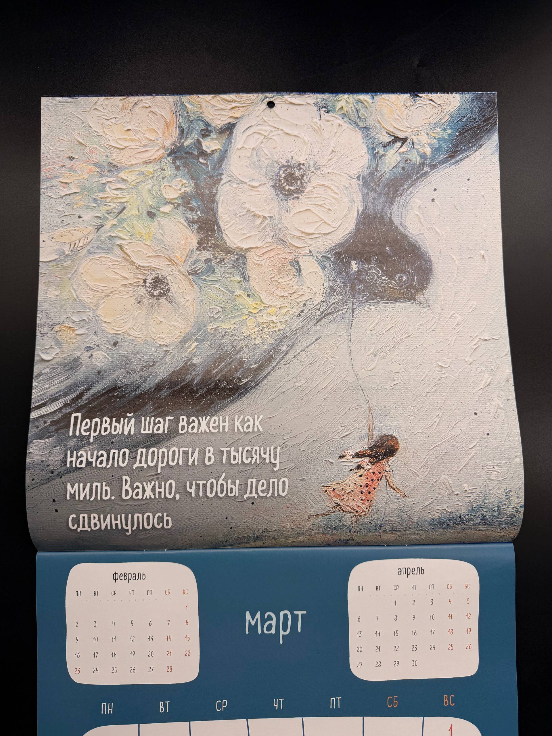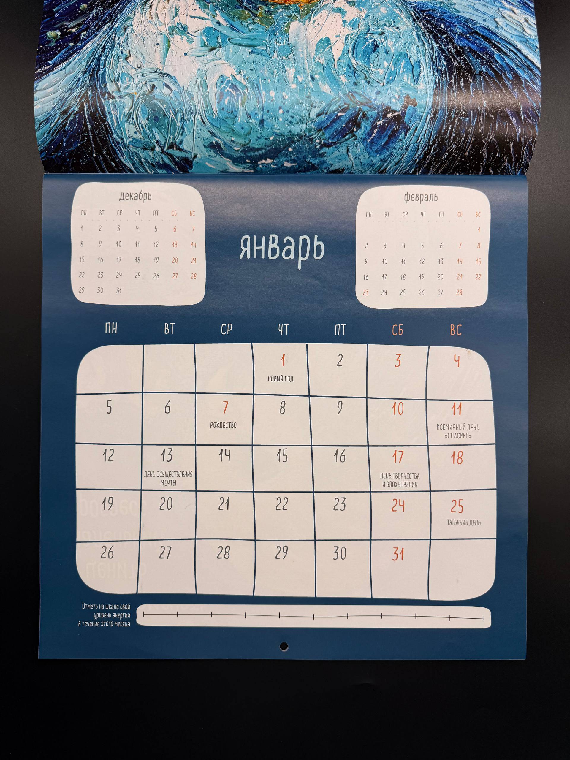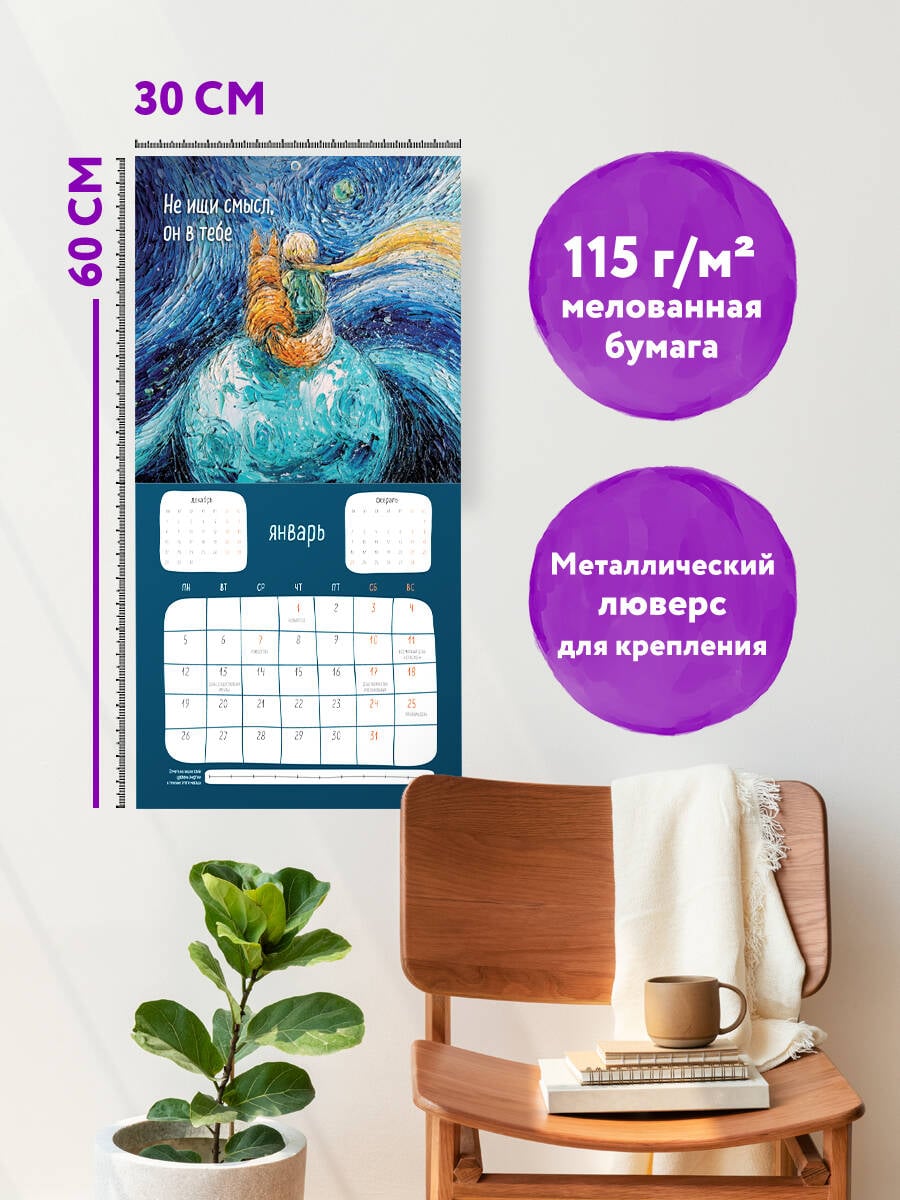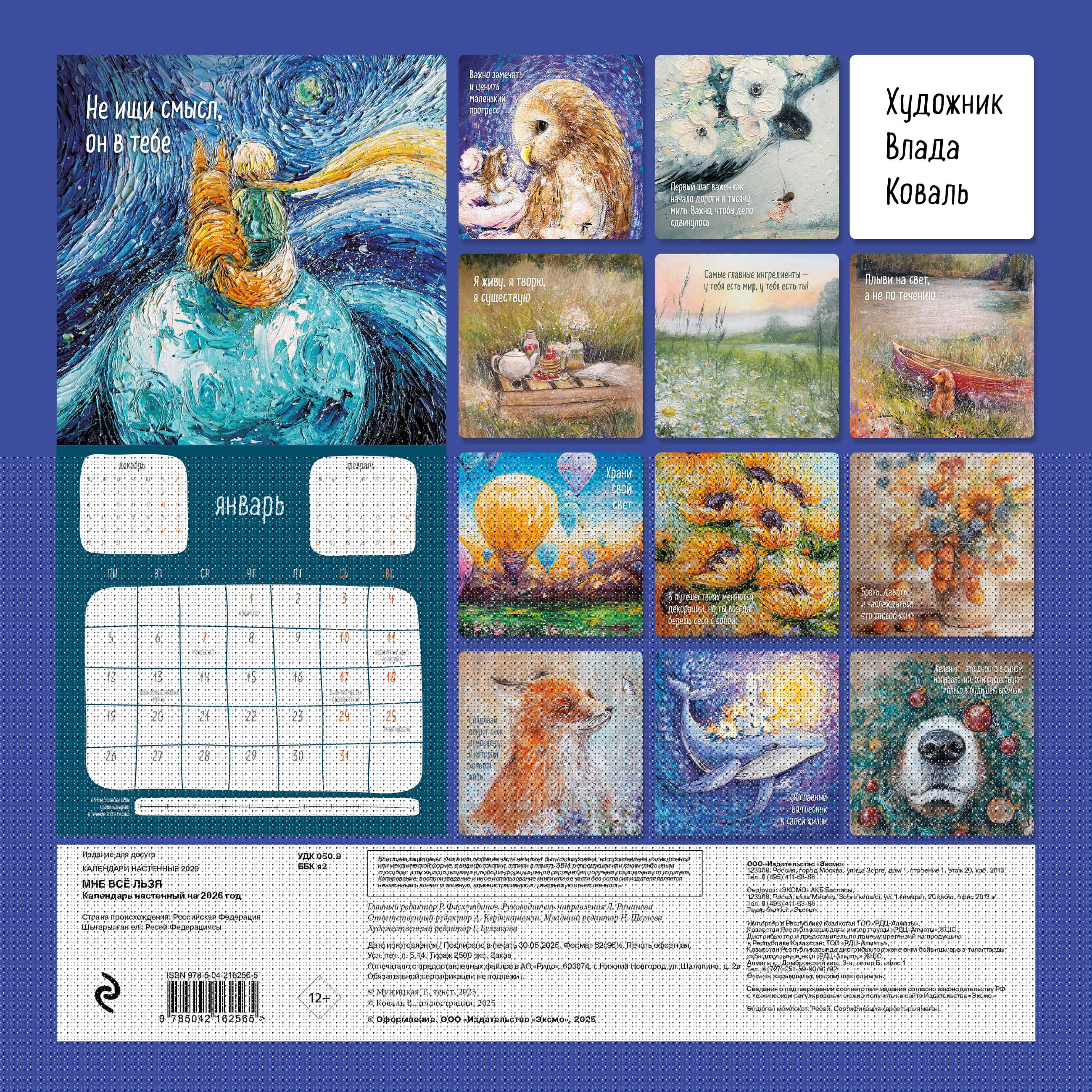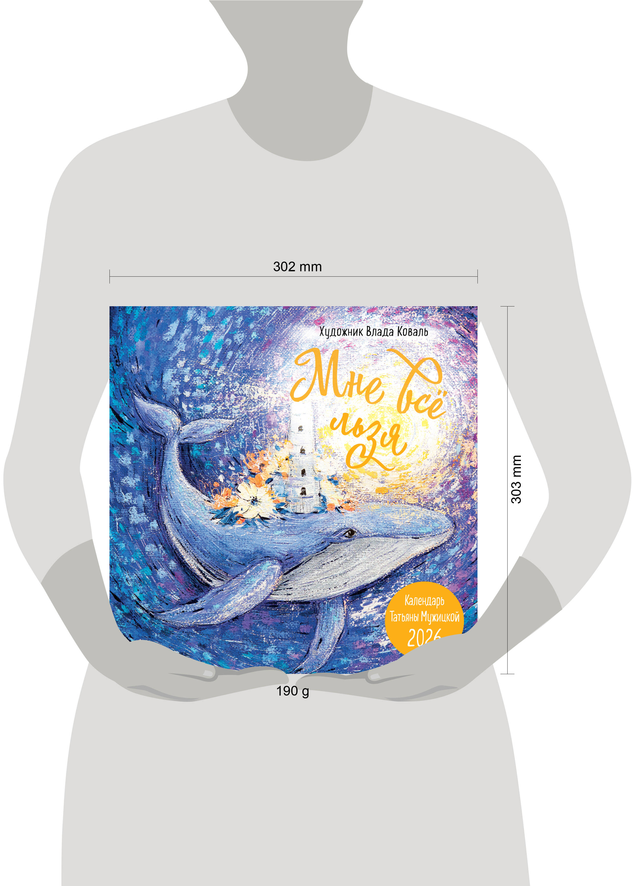 Наши настенные календари отличаются высоким качеством исполнения! Тщательно подобранные иллюстрации, напечатанные на глянцевой бумаге высочайшего качества, станут настоящим украшением дома, а в календарной сетке найдется место для ваших планов: большие клетки позволят делать записи и организовать свой год! В серии настенных календарей издательства «ЭКСМО» каждый найдет тему по вкусу: великие художники, великолепные подборки с самыми знаменитыми произведениями искусства, легендарные кинематографические саги и игры, главные книжные авторы и бестселлеры, фотографии и иллюстрации любимых животных и многое-многое другое! Календарь Татьяны Мужицкой с яркими иллюстрациями от Влады Коваль! В сетке - вдохновляющие цитаты автора и необычные праздники вроде «Всемирного дня "Спасибо"» и «Международного дня заботы о себе». Каждый месяц - как напоминание: жить можно с радостью, легкостью и любовью к себе. Совокупный тираж книг Татьяны Мужицкой - 360 000 экземпляров. Технические параметры: - Тип календаря - настенный перекидной. - Год - 2026. - Календарная сетка - с разбивкой по месяцам. - Вид скрепления - скрепка. - Ширина - 30 см. - Высота - 30 см. - Внутренний блок - мелованная бумага 150 г/м2. - Подложка - плотный гофрокартон для поддержания формы. - Индивидуальная упаковка в плотный целлофановый пакет.