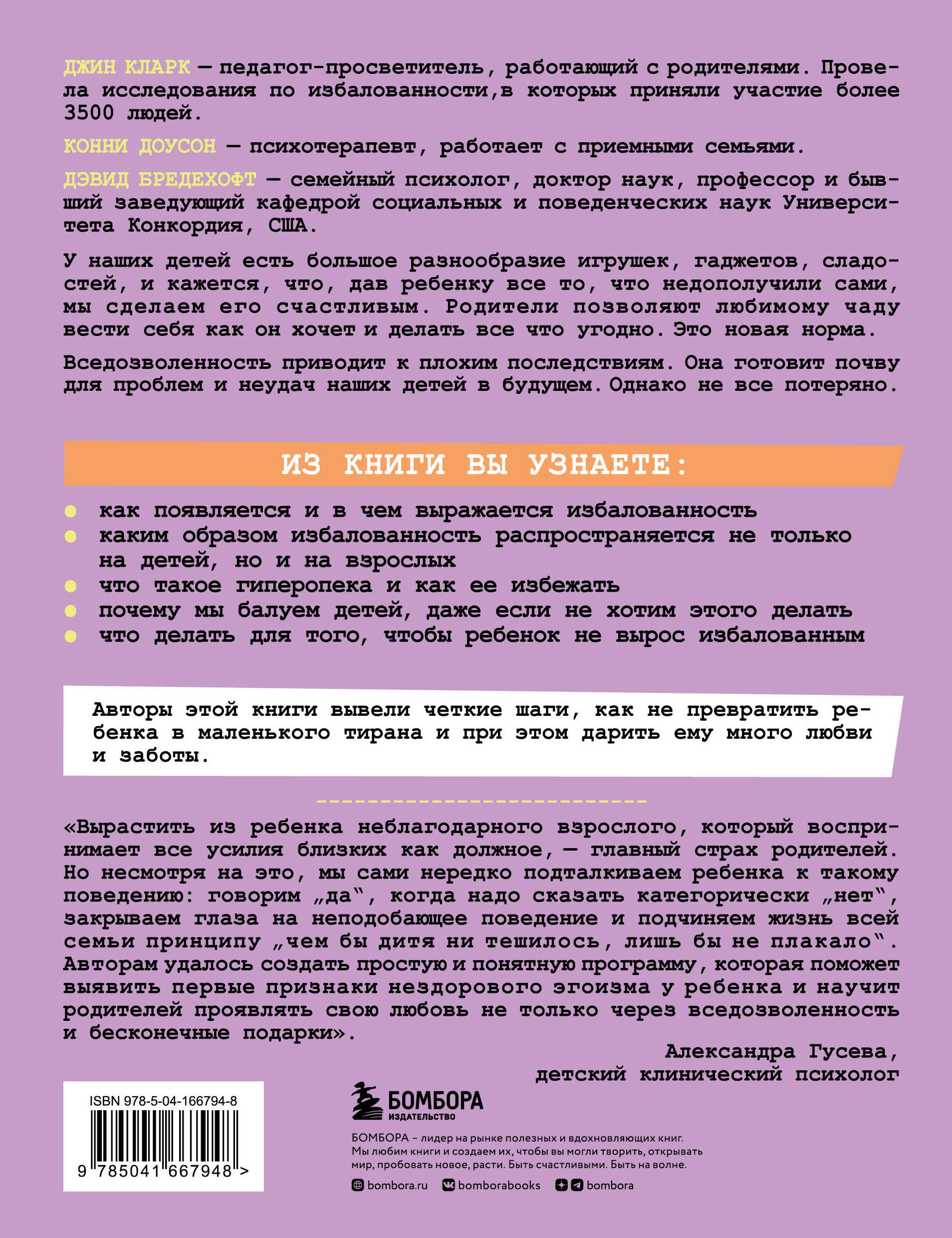 Сегодня мы живем в эпоху изобилия. У наших детей есть большое разнообразие игрушек, гаджетов, сладостей, и нам кажется, что дав ребенку все то, что не дополучили сами, мы сделаем его счастливым. Мы позволяем любимому чаду вести себя, как он хочет, и делать все, что угодно. Это новая норма. Но вседозволенность приводит к плохим последствиям. Она готовит почву для проблем и неудач наших детей в будущем. Однако не все потеряно. Авторы этой книги вывели четкие шаги, как не превратить ребенка в маленького тирана и при этом дарить ему много любви и заботы. Из этой книги вы узнаете: • как появляется и в чем выражается избалованность; • каким образом избалованность распространяется не только на детей, но и на взрослых; • что такое гиперопека и как ее избежать; • почему мы балуем детей, даже если не хотим этого делать; • что делать для того, чтобы ребенок не вырос избалованным. Кто авторы Джин Иллсли Кларк - педагог-просветитель, работающий с родителями. Провела исследования по избалованности, в которых приняли участие более 3500 людей. Конни Доусон - психотерапевт, работает с приемными семьями. Дэвид Бредехофт - семейный психолог, доктор наук, профессор и бывший заведующий кафедрой социальных и поведенческих наук Университета Конкордия, США.| Издательство | ООО "Издательство "Эксмо" |
