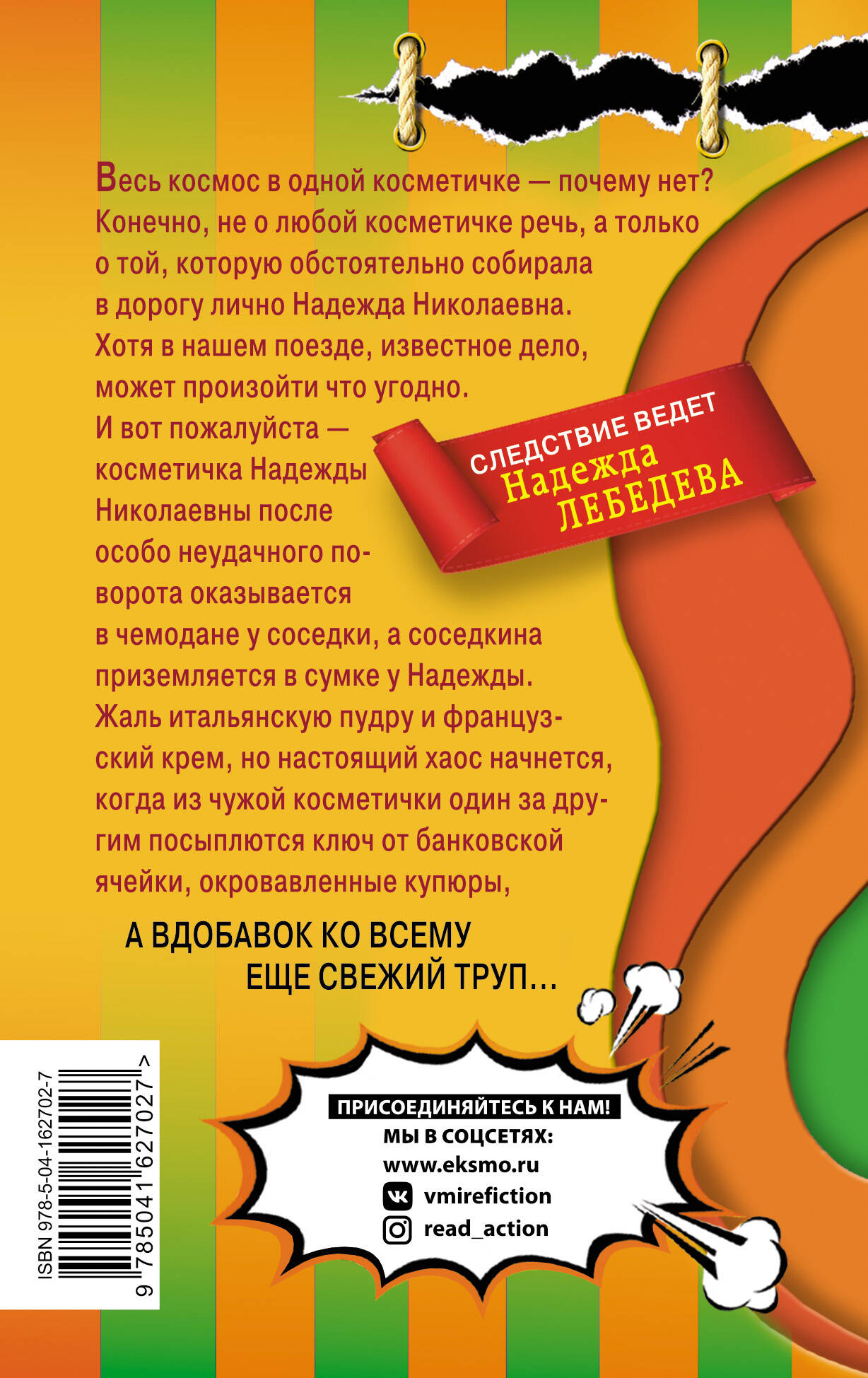 Весь космос в одной косметичке - почему нет? Конечно, не о любой косметичке речь, а только о той, которую обстоятельно собирала в дорогу лично Надежда Николаевна. Хотя в нашем поезде, известное дело, может произойти что угодно. И вот пожалуйста - косметичка Надежды Николаевны после особо неудачного поворота оказывается в чемодане у соседки, а соседкина приземляется в сумке у Надежды. Жаль итальянскую пудру и французский крем, но настоящий хаос начнется, когда из чужой косметички один за другим посыплются ключ от банковской ячейки, окровавленные купюры, а вдобавок ко всему еще свежий труп… Наталья Александрова имеет редкий дар видеть смешное и удивительное в обыденном. Ее герои колоритны и обаятельны, а сюжет забавен и непредсказуем. Великолепный легкий образный язык и неповторимый стиль привлекают ценителей детективного жанра. Романы Натальи Александровой переведены на многие европейские языки.| Издательство | Эксмо |