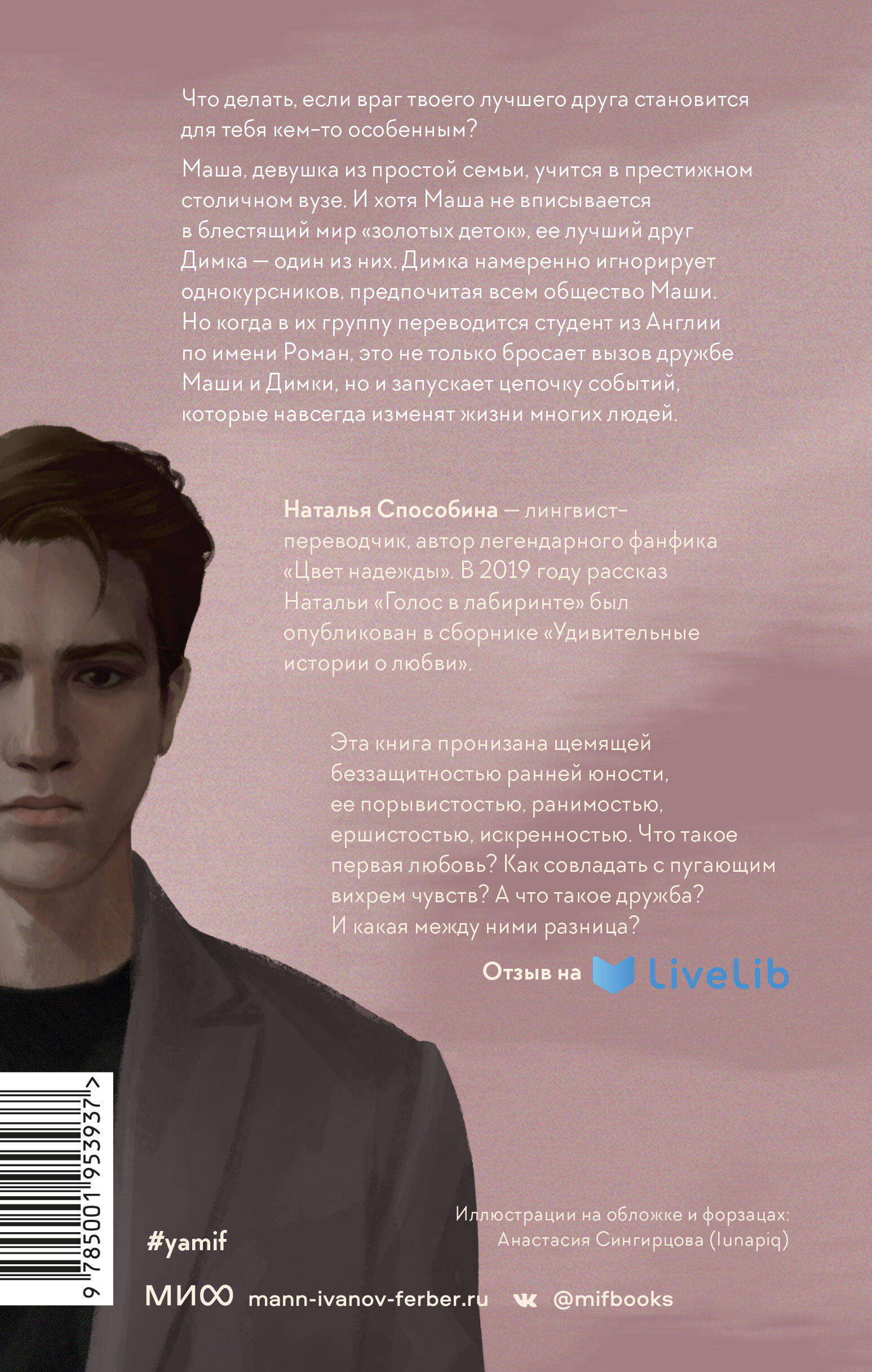 Светлый и добрый роман, который поднимает проблемы отцов и детей, дружбы, предательства, самопринятия, преодоления травм и комплексов. Что делать, если враг твоего лучшего друга становится для тебя кем-то особенным? Маша, девушка из простой семьи, учится в престижном столичном вузе. И хотя Маша не вписывается в блестящий мир "золотых деток", ее лучший друг Димка - один из них. Димка намеренно игнорирует однокурсников, предпочитая всем общество Маши. Когда в их группу переводится студент из Англии по имени Роман, это не только бросает вызов дружбе Маши и Димки, но и запускает цепочку событий, которые навсегда изменят жизни многих людей. Для кого эта книга: Для тех, кто любит трогательные и добрые истории. Для тех, кому хочется почитать хорошую книгу современного российского автора. Для тех, кто любит фанфик "Цвет надежды" и творчество Натальи Способиной. Для тех, кто хочет поностальгировать и вспомнить свою юность.| Издательство | МАНН, ИВАНОВ И ФЕРБЕР ООО |