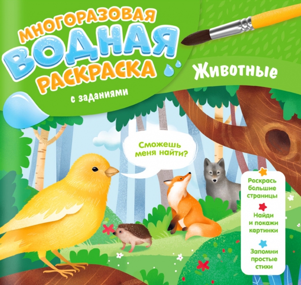 Многоразовая водная раскраска с заданиями поможет малышу почувствовать себя настоящим волшебником! Проведите по листу мокрой кисточкой - и он превратится в яркий рисунок. А когда картинка высохнет, её снова можно будет раскрасить. Книжка-раскраска с заданиями и развивающими стихами познакомит ребёнка с животными Земли - читайте, раскрашивайте и ищите, кто спрятался на страницах книжки!