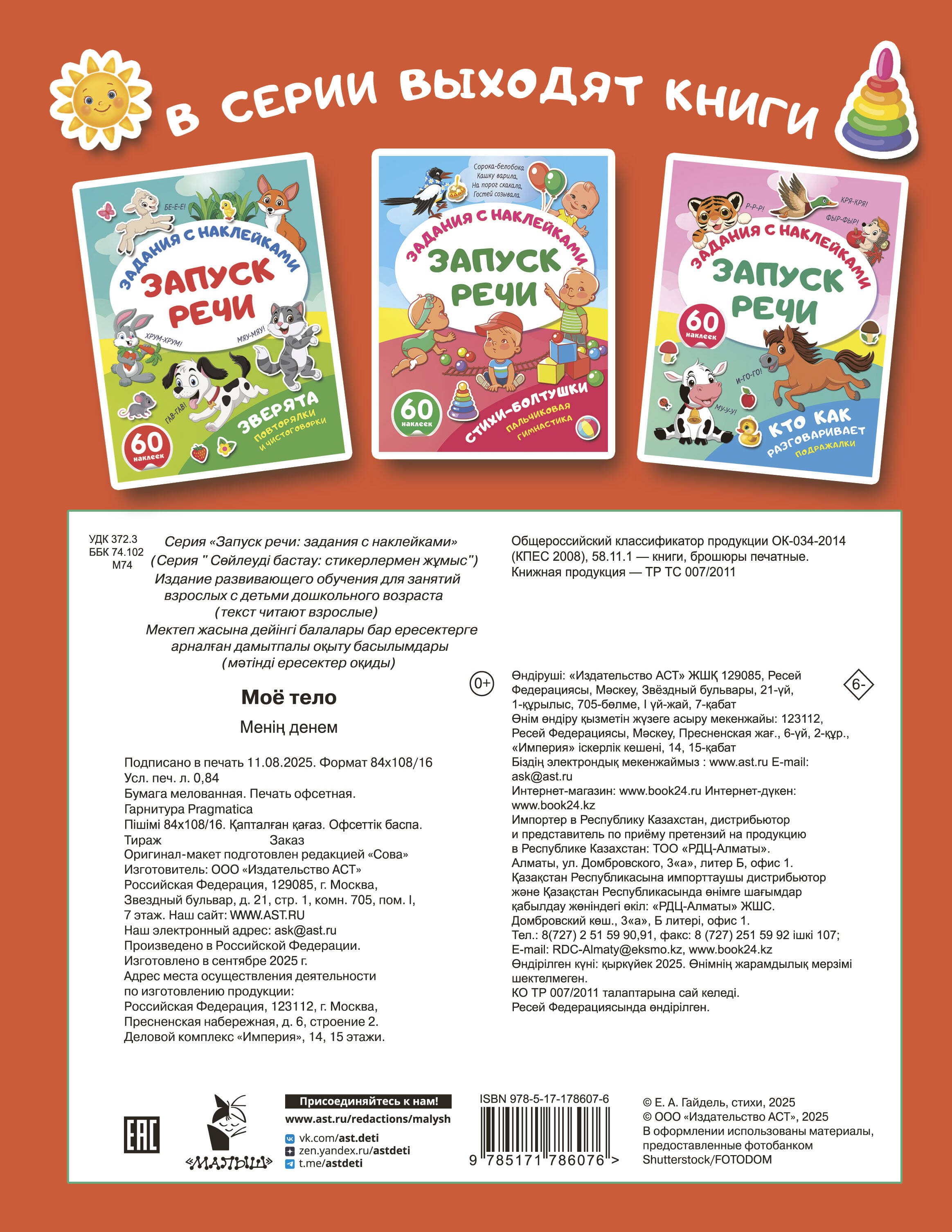 Яркие картинки + 60 наклеек + маленькие задания + короткие авторские стихи в развивающей книге «Моё тело» - всё что нужно для запуска речи и развития речевых навыков. Прекрасное полиграфическое исполнение - хороший, современный дизайн, плотная бумага отличного качества. Интерактивная книжка-игра - идеальный помощник для родителей, которые хотят заниматься с ребёнком с самого раннего возраста. С нашей книгой малыш делает первый шаг к изучению строения собственного тела, соотношению себя с другими людьми. На каждой странице - крупные картинки + весёлые стихи для повторения с ребёнком. Рассказывайте истории по рисункам, задавайте вопросы и сами на них отвечайте, читайте стихи медленно и выразительно. На первых порах ребёнок будет слушать и показывать на иллюстрации - вот малыш кушает, вот малыш купается, вот малыш играет, и постепенно ребёнок узнает и запомнит новые слова. научится говорить правильно и выразительно, вырастет любознательным и общительным. В книге 60 крупных стикеров с хорошей печатью, легко отделяются от основы - идеально подойдут для детских пальчиков и разовьют познавательную активность. Не упустите шанс сделать обучение интересным и эффективным - выберите книгу от издательства «Малыш» уже сегодня!| Издательство | Издательство "АСТ" |