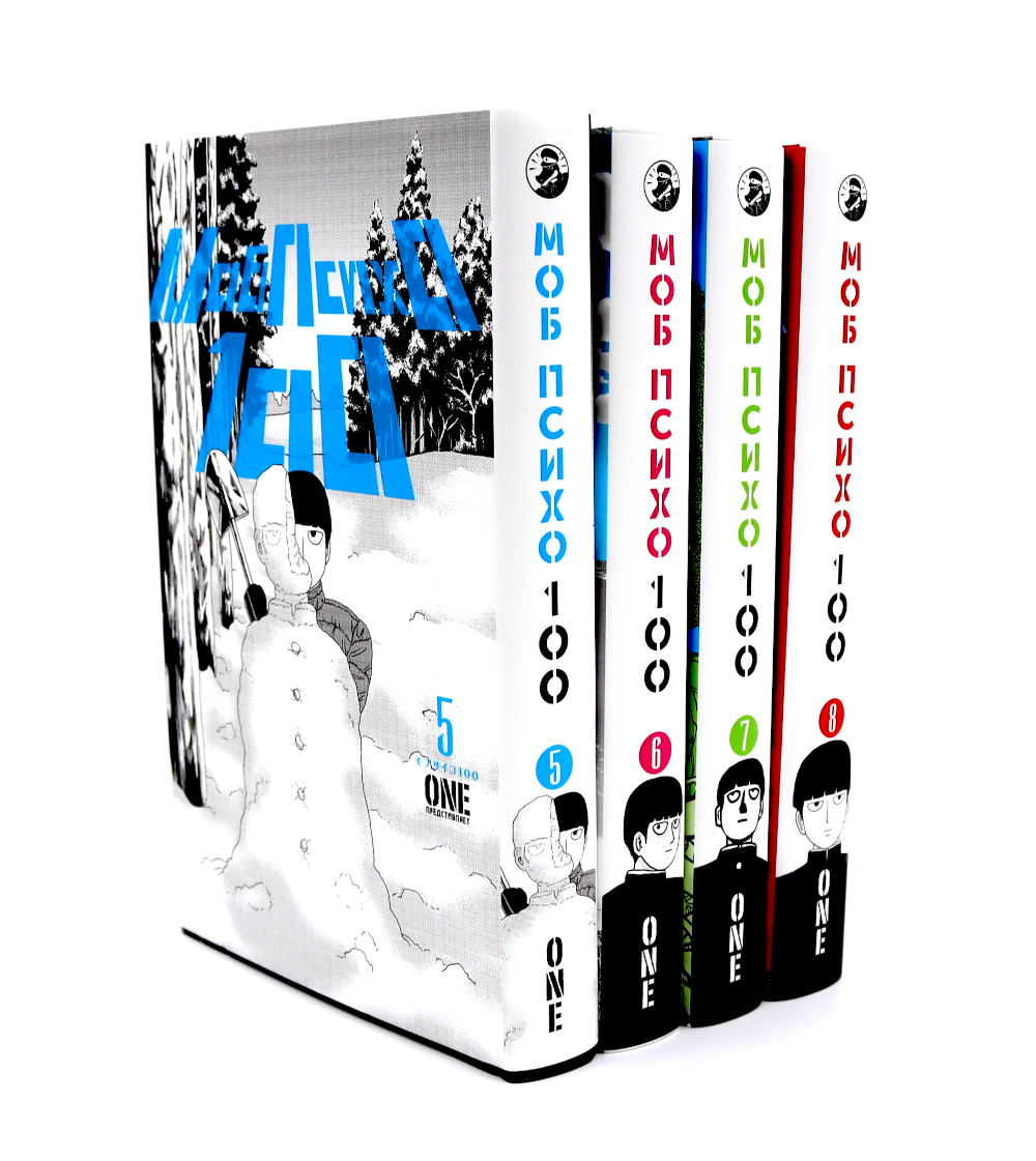 Комплект состоит из четырех томов (5-8) манги ONE «Моб Психо 100». Пятый том: Моб и Рэйгэн. Ученик и учитель. Неужто между ними разлад?! Моб с товарищами вернулись к рутине после эпохального экзорцизма. Но лишь стоило Рэйгэну обронить резкое слово, как Моб оставил подработку. И вот Рэйгэна, ведущего дела уже без помощи Моба, зовут на ТВ! Шестой том полного собрания приключений школьника-экстрасенса Сигэо Кагэямы, в которую вошли 11 и 12 книги оригинального Японского издания. В захваченном городе идёт битва экстрасенсов! Злодейская организация экстрасенсов «Коготь» объявила о захвате мира и разрушает город Специй. Чтобы остановить их, Рэйгэн и остальные направляются к Башне культуры, где засел босс «Когтя». На пути наших героев поджидают сильные соперники... Седьмой том: И кто же основатель?! «Учение Психошлема» разрастается! Из-за взрыва сверхспособностей в городе появилось огромное растение, также известное как «Божественное древо». Чтобы заполучить сверхсилу, в город Специй стекаются духи и религиозные секты. Меж тем, Моб живёт полной жизнью! В предпоследнюю книгу серии вошли 13 и 14 тома оригинального японского издания. Восьмой том - Финальная книга серии! Приближаются зимние каникулы, и вместе с ними - окончание средней школы у третьегодок. Моб хочет, чтобы Томэ Курата (глава клуба телепатии) пообщалась с инопланетянами до выпускного. Что же предпримут Моб и его друзья, чтобы найти телепата?! И чем закончатся приключения полюбившегося всем мальчика-медиума? В финальную книгу серии вошли 15 и 16 тома оригинального японского издания.| Издательство | Терлецки Комикс |