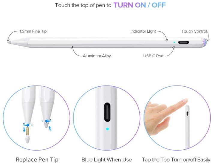 Умный Bluetooth стилус совместимый с iPad планшетами от 2018 года выпуска - тонкий и легкий, как обычный карандаш. Перо с наконечником 1,5 мм обеспечивает точное письмо благодаря и создает ощущение реалистичности во время рисования. Так же вы можете положить руку на экран благодаря встроенной функции отклонения ладони.