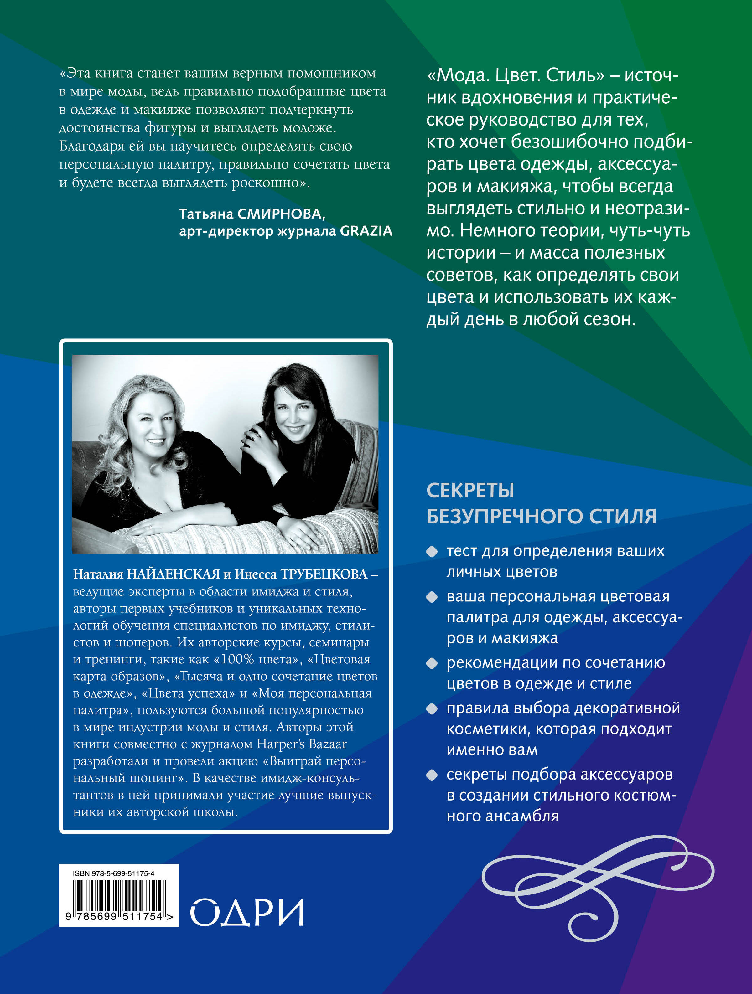 Книга имиджмейкеров Наталии Найденской и Инессы Трубецковой - источник вдохновения и практическое руководство для тех, кто хочет безошибочно подбирать цвета одежды, аксессуаров и макияжа, чтобы всегда выглядеть стильно и неотразимо. Немного теории, чуть-чуть истории и масса полезных советов, как определять свои цвета и использовать их каждый день в любой сезон. Правильно подобранный цвет одежды и макияжа может изменить внешность: сделать фигуру стройной, глаза яркими, скрыть морщины, сделать кожу сияющей и создать визуальный эффект лифтинга. Но это только часть "работы" вашей персональной палитры. Подбирая гардероб в правильных для вас цветах - для работы, вечеринки, важного свидания, собеседования или обеда с друзьями - вы будете уверены, что одеты наилучшим образом. Пройдите тест, изучите характеристики цвета и смело отправляйтесь в увлекательное разноцветное путешествие - ищите новые смелые сочетания, экспериментируйте, развивайте свой вкус! Все, что для этого нужно, вы уже держите в своих руках. И знайте: это только начало. Чем глубже вы будете узнавать тайны цвета, тем интереснее и ярче будет ваша жизнь.